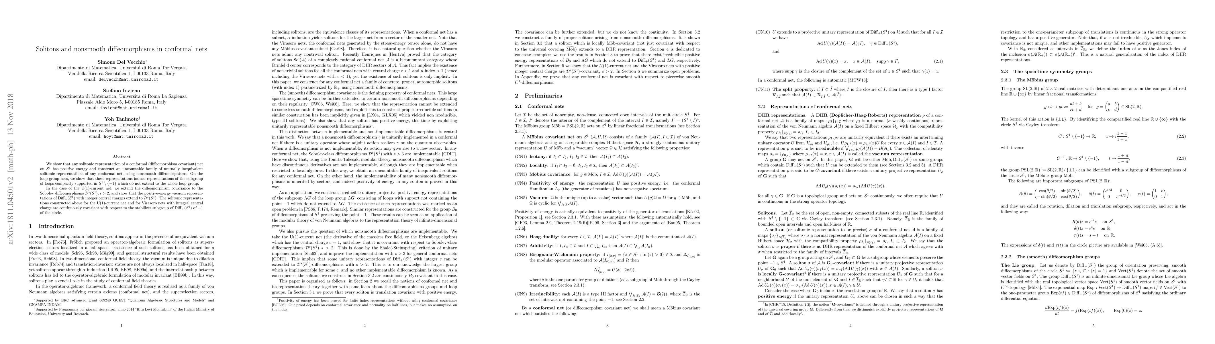 The paper introduces a novel method for constructing solitonic representations of conformal nets using nonsmooth diffeomorphisms and extends diffeomorphism covariance to Sobolev diffeomorphisms.