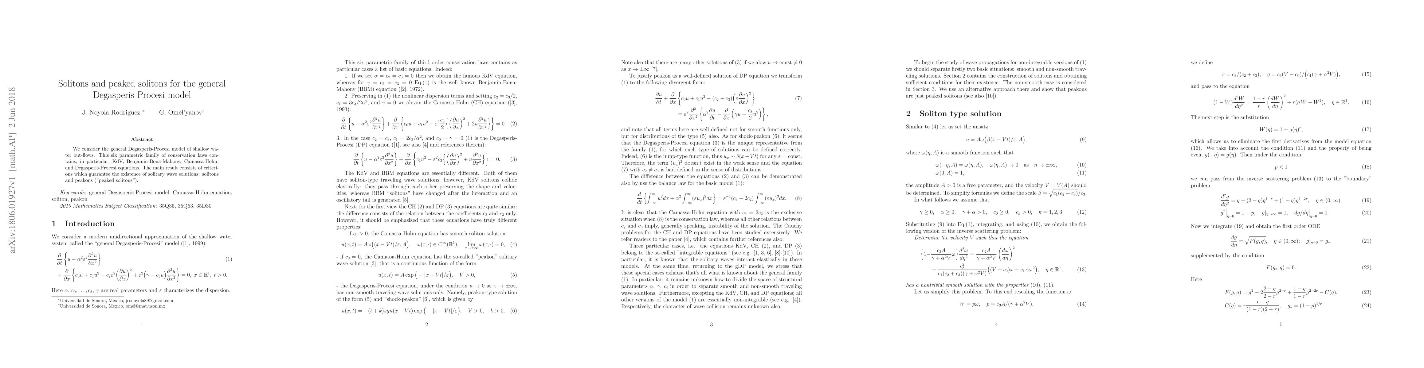 This paper explores the general Degasperis-Procesi model, a six-parametric family of conservation laws, and provides criteria for the existence of solitary wave solutions, including solitons and peakons (peaked solitons).
