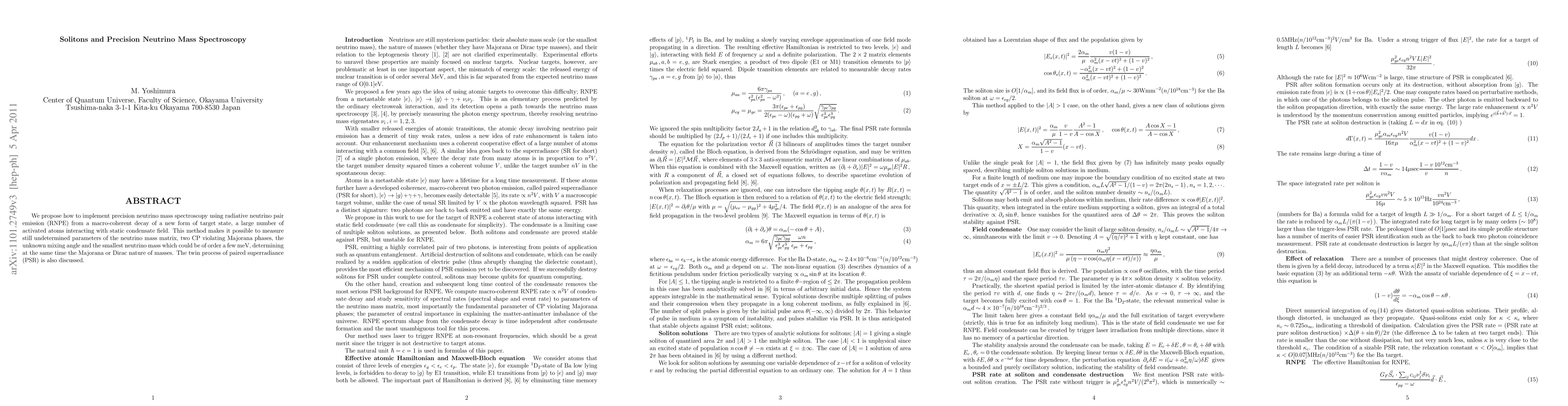 We propose how to implement precision neutrino mass spectroscopy using radiative neutrino pair emission (RNPE) from a macro-coherent decay of a new form of target state, a large number of activated atoms interacting with static condensate field. This method makes it possible to measure still undetermined parameters of the neutrino mass matrix, two CP violating Majorana phases, the unknown mixing angle and the smallest neutrino mass which could be of order a few meV, determining at the same time the Majorana or Dirac nature of masses. The twin process of paired superradiance (PSR) is also discussed.