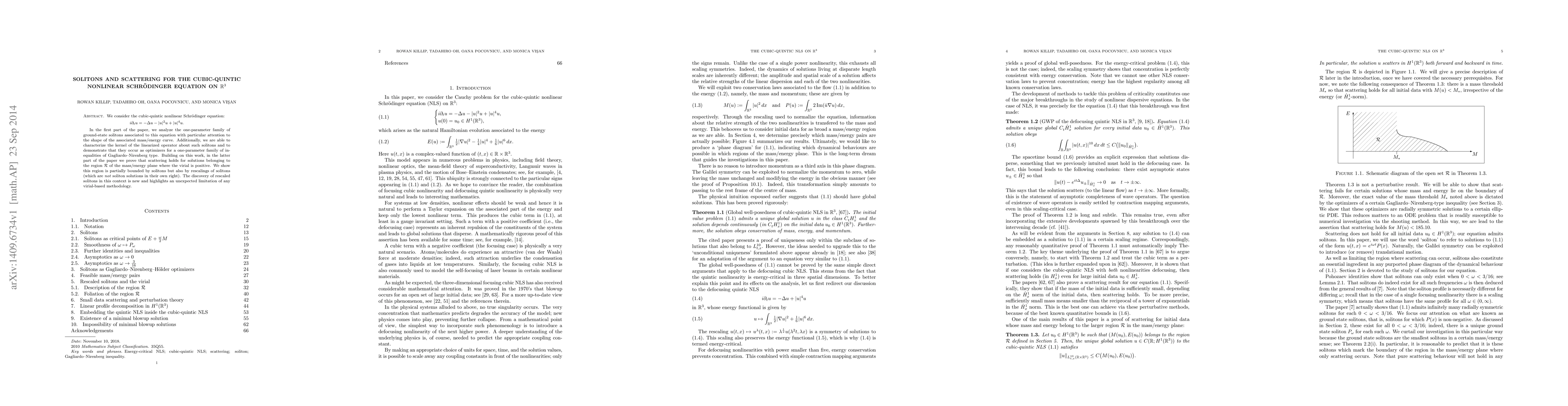 We consider the cubic-quintic nonlinear Schr\"odinger equation: \[ i\partial_t u = -\Delta u - |u|^2u + |u|^4u. \] In the first part of the paper, we analyze the one-parameter family of ground-state solitons associated to this equation with particular attention to the shape of the associated mass/energy curve. Additionally, we are able to characterize the kernel of the linearized operator about such solitons and to demonstrate that they occur as optimizers for a one-parameter family of inequalities of Gagliardo--Nirenberg type. Building on this work, in the latter part of the paper we prove that scattering holds for solutions belonging to the region $\mathcal{R}$ of the mass/energy plane where the virial is positive. We show this region is partially bounded by solitons but also by rescalings of solitons (which are not soliton solutions in their own right). The discovery of rescaled solitons in this context is new and highlights an unexpected limitation of any virial-based methodology.