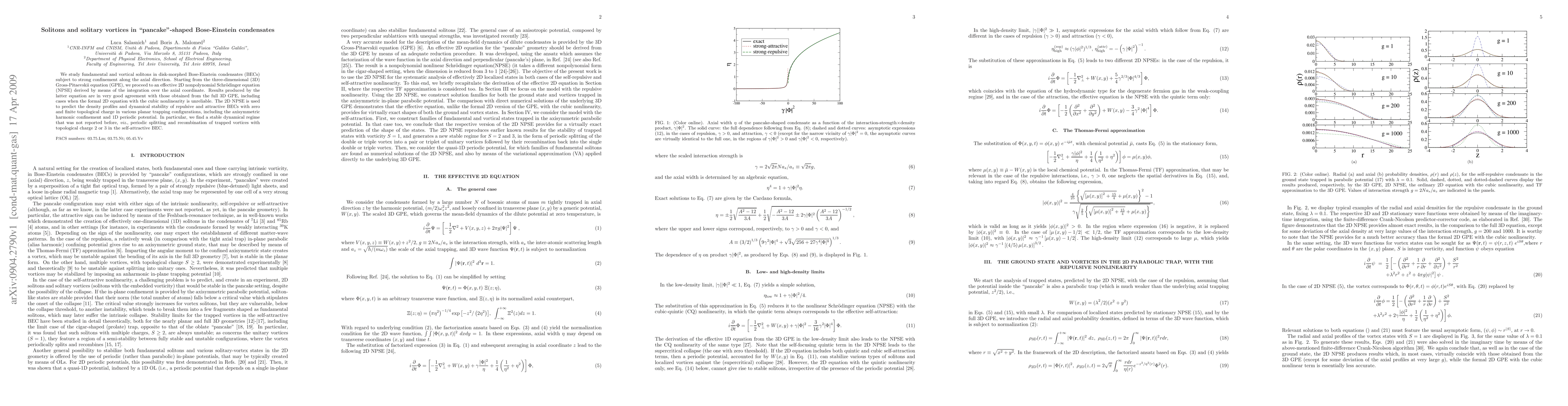 We study fundamental and vortical solitons in disk-morphed Bose-Einstein condensates (BECs) subject to strong confinement along the axial direction. Starting from the three-dimensional (3D) Gross-Pitaevskii equation (GPE), we proceed to an effective 2D nonpolynomial Schroeodinger equation (NPSE) derived by means of the integration over the axial coordinate. Results produced by the latter equation are in very good agreement with those obtained from the full 3D GPE, including cases when the formal 2D equation with the cubic nonlinearity is unreliable. The 2D NPSE is used to predict density profiles and dynamical stability of repulsive and attractive BECs with zero and finite topological charge in various planar trapping configurations, including the axisymmetric harmonic confinement and 1D periodic potential. In particular, we find a stable dynamical regime that was not reported before, viz., periodic splitting and recombination of trapped vortices with topological charge 2 or 3 in the self-attractive BEC.