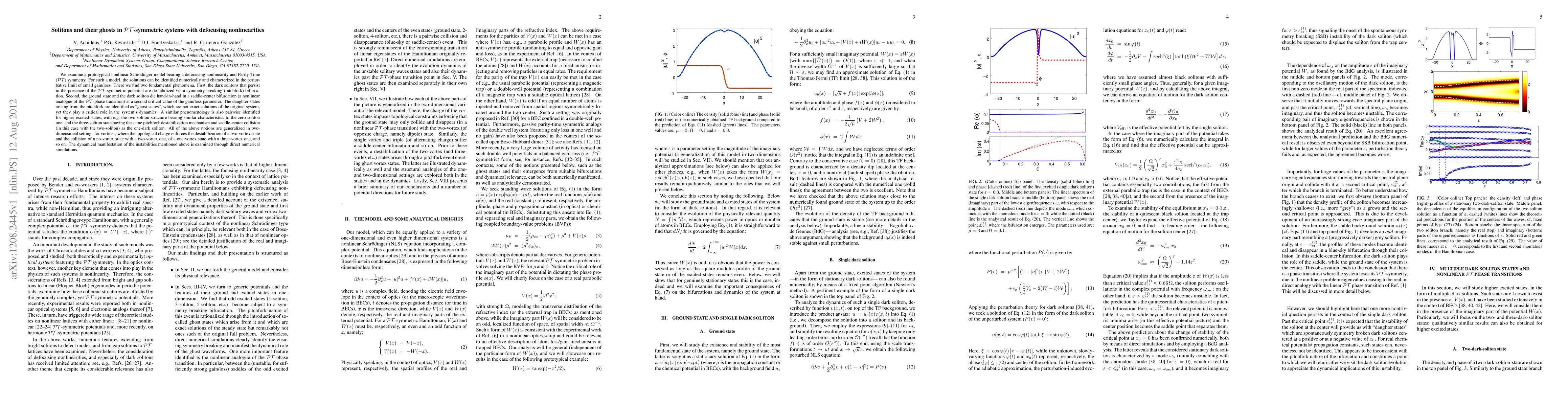 We examine a prototypical nonlinear Schr\"odinger model bearing a defocusing nonlinearity and Parity-Time (PT) symmetry. For such a model, the solutions can be identified numerically and characterized in the perturbative limit of small gain/loss. There we find two fundamental phenomena. First, the dark solitons that persist in the presence of the PT-symmetric potential are destabilized via a symmetry breaking (pitchfork) bifurcation. Second, the ground state and the dark soliton die hand-in-hand in a saddle-center bifurcation (a nonlinear analogue of the PT-phase transition) at a second critical value of the gain/loss parameter. The daughter states arising from the pitchfork are identified as "ghost states", which are not exact solutions of the original system, yet they play a critical role in the system's dynamics. A similar phenomenology is also pairwise identified for higher excited states, with e.g. the two-soliton structure bearing similar characteristics to the zero-soliton one, and the three-soliton state having the same pitchfork destabilization mechanism and saddle-center collision (in this case with the two-soliton) as the one-dark soliton. All of the above notions are generalized in two-dimensional settings for vortices, where the topological charge enforces the destabilization of a two-vortex state and the collision of a no-vortex state with a two-vortex one, of a one-vortex state with a three-vortex one, and so on. The dynamical manifestation of the instabilities mentioned above is examined through direct numerical simulations.