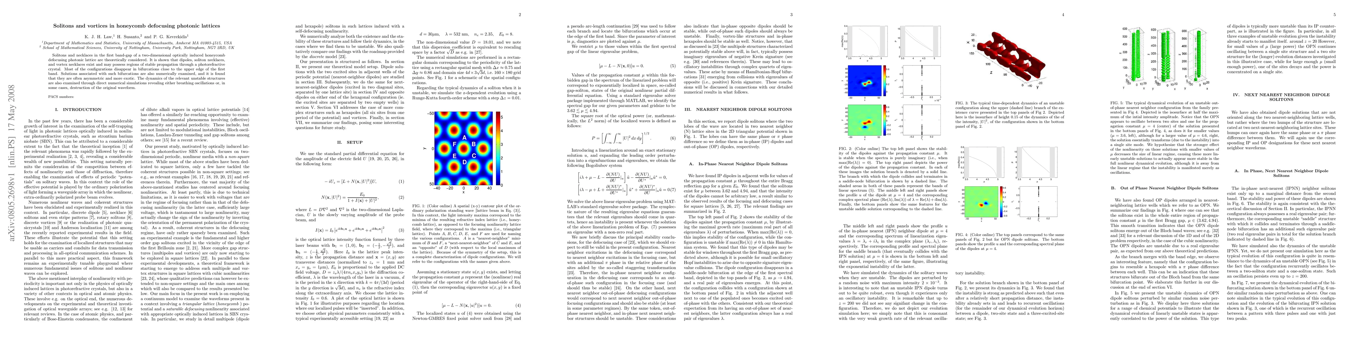The paper explores solitons and vortices in a 2D honeycomb-shaped defocusing photonic lattice, identifying stable dipoles, soliton necklaces, and vortex necklaces. Numerical simulations reveal that most configurations disappear near the first band's upper edge, leading to asymmetric and exotic solutions, with unstable structures showing breathing oscillations or waveform destruction.