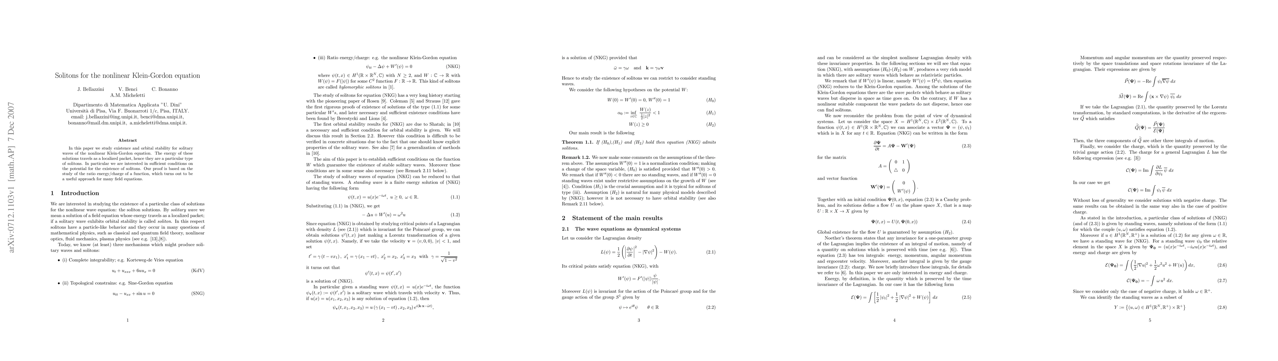 In this paper we study existence and orbital stability for solitary waves of the nonlinear Klein-Gordon equation. The energy of these solutions travels as a localized packet, hence they are a particular type of solitons. In particular we are interested in sufficient conditions on the potential for the existence of solitons. Our proof is based on the study of the ratio energy/charge of a function, which turns out to be a useful approach for many field equations.