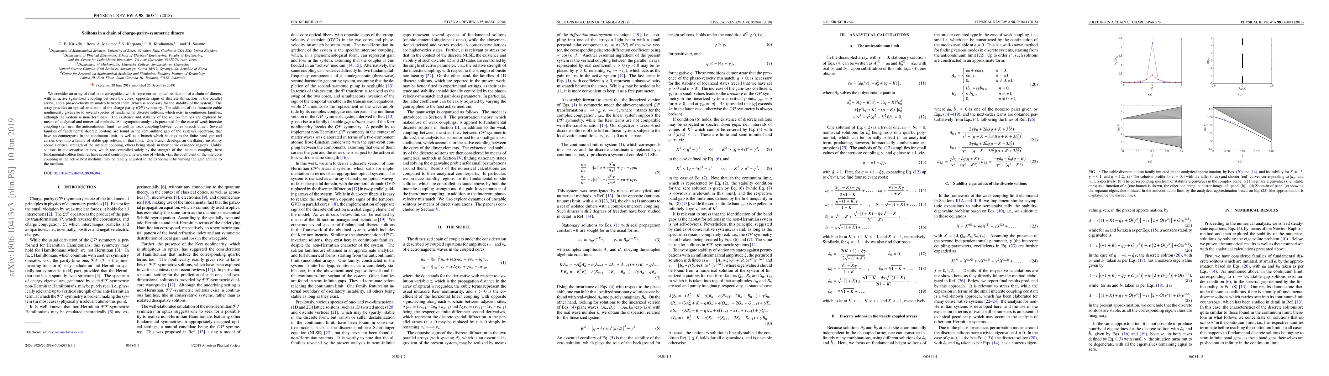 We consider an array of dual-core waveguides, which represent an optical realization of a chain of dimers, with an active (gain-loss) coupling between the cores, opposite signs of discrete diffraction in the parallel arrays, and a phase-velocity mismatch between them (which is necessary for the stability of the system). The array provides an optical emulation of the charge-parity ($\mathcal{CP}$) symmetry. The addition of the intracore cubic nonlinearity gives rise to several species of fundamental discrete solitons, which exist in continuous families, although the system is non-Hermitian. The existence and stability of the soliton families are explored by means of analytical and numerical methods. An asymptotic analysis is presented for the case of weak intersite coupling (i.e., near the anticontinuum limit), as well as weak coupling between cores in each dimer. Several families of fundamental discrete solitons are found in the semi-infinite gap of the system's spectrum, that have no counterparts in the continuum limit, as well as a branch which belongs to the finite band gap and carries over into a family of stable gap solitons in that limit. One branch develops an oscillatory instability above a critical strength of the intersite coupling, others being stable in their entire existence regions. Unlike solitons in conservative lattices, which are controlled solely by the strength of the intersite coupling, here fundamental-soliton families have several control parameters, one of which, viz., the coefficient of the intercore coupling in the active host medium, may be readily adjusted in the experiment by varying the gain applied to the medium.