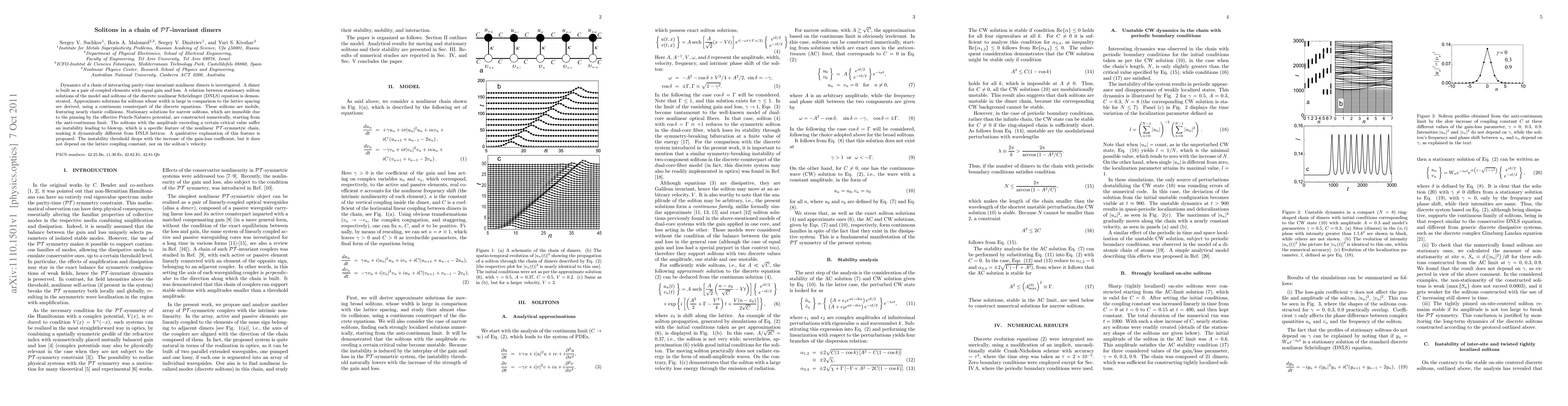 Dynamics of a chain of interacting parity-time invariant nonlinear dimers is investigated. A dimer is built as a pair of coupled elements with equal gain and loss. A relation between stationary soliton solutions of the model and solitons of the discrete nonlinear Schrodinger (DNLS) equation is demonstrated. Approximate solutions for solitons whose width is large in comparison to the lattice spacing are derived, using a continuum counterpart of the discrete equations. These solitons are mobile, featuring nearly elastic collisions. Stationary solutions for narrow solitons, which are immobile due to the pinning by the effective Peierls-Nabarro potential, are constructed numerically, starting from the anti-continuum limit. The solitons with the amplitude exceeding a certain critical value suffer an instability leading to blowup, which is a specific feature of the nonlinear PT-symmetric chain, making it dynamically different from DNLS lattices. A qualitative explanation of this feature is proposed. The instability threshold drops with the increase of the gain-loss coefficient, but it does not depend on the lattice coupling constant, nor on the soliton's velocity.
