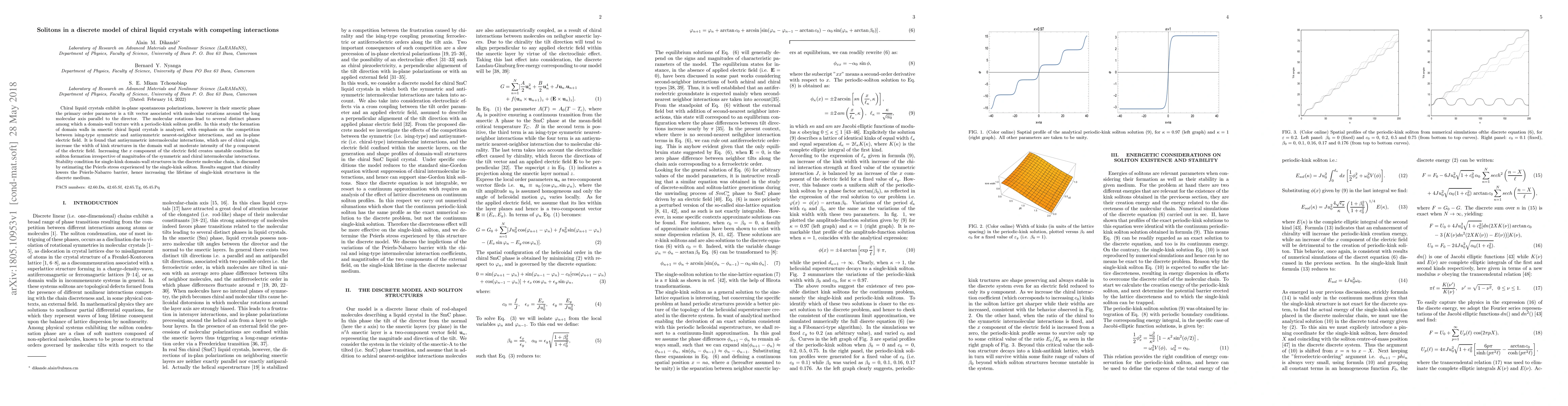 Chiral liquid crystals exhibit in-plane spontaneous polarizations, however in their smectic phase the primary order parameter is a tilt vector associated with molecular rotations around the long molecular axis parallel to the director. The molecular rotations lead to several distinct phases among which a domain-wall texture with a periodic-kink soliton profile. In this study the formation of domain walls in smectic chiral liquid crystals is analyzed, with emphasis on the competition between ising-type symmetric and antisymmetric nearest-neighbor interactions, and an in-plane electric field. It is found that antisymmetric intermolecular interactions, which are of chiral origin, increase the width of kink structures in the domain wall at moderate intensity of the $y$ component of the electric field. Increasing the $x$ component of the electric field creates unstable condition for soliton formation irrespective of magnitudes of the symmetric and chiral intermolecular interactions. Stability condition for single-kink domain-wall structures in the discrete molecular chain, is discussed by estimating the Peierls stress experienced by the single-kink soliton. Results suggest that chirality lowers the Peierls-Nabarro barrier, hence increasing the lifetime of single-kink structures in the discrete medium.