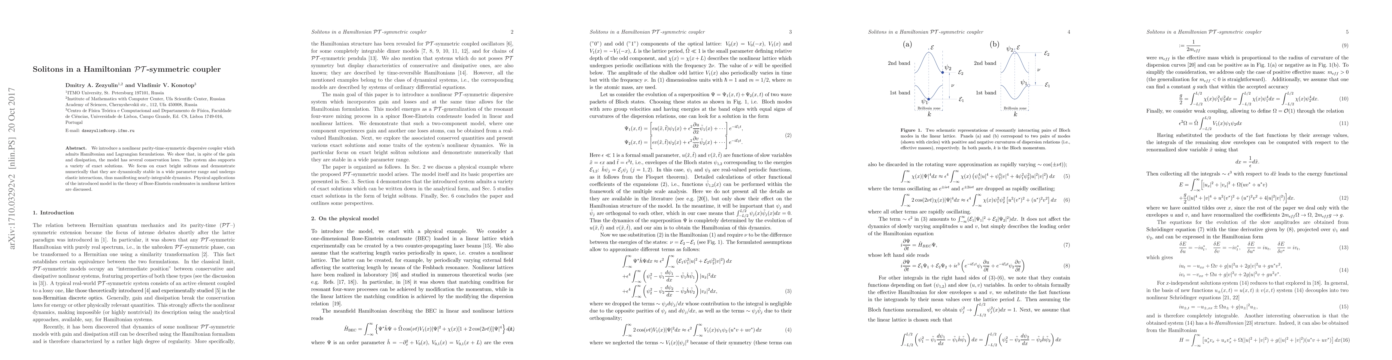 The research presents a Hamiltonian PT-symmetric coupler model with conservation laws, supporting stable and interacting bright solitons. Its potential applications in Bose-Einstein condensates in nonlinear lattices are discussed.