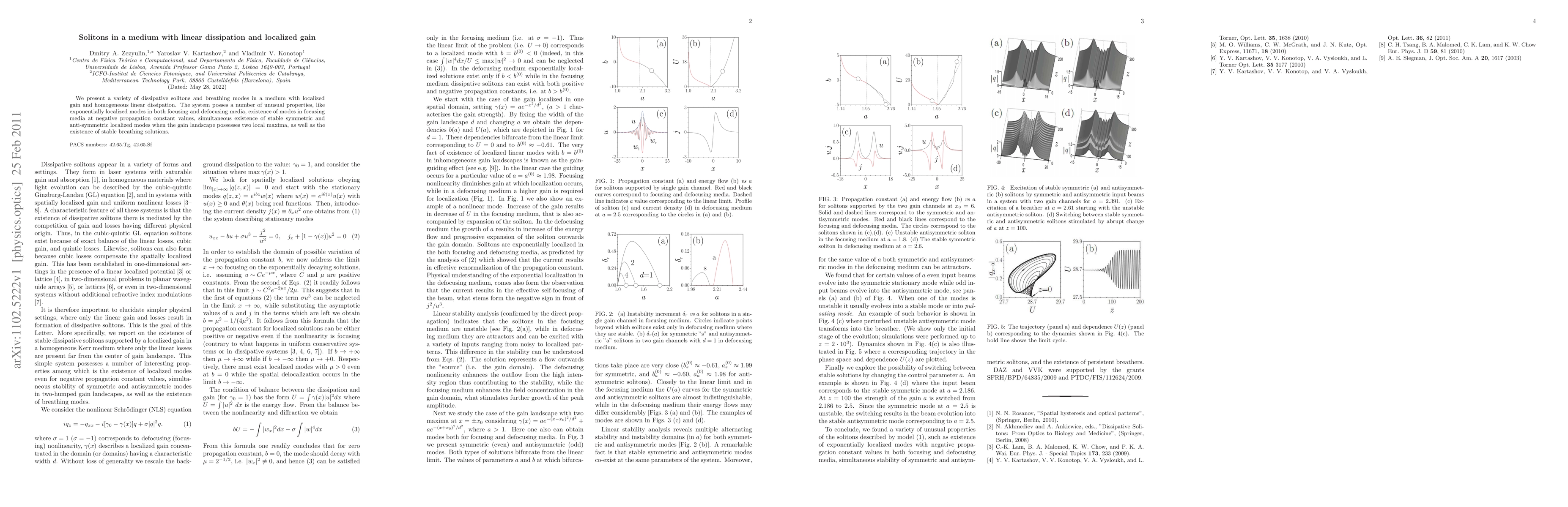The paper explores dissipative solitons and breathing modes in a medium with linear dissipation and localized gain, revealing exponentially localized modes in various media, stable symmetric and anti-symmetric modes with dual local gain maxima, and breathing solutions, demonstrating unique properties not observed in traditional systems.