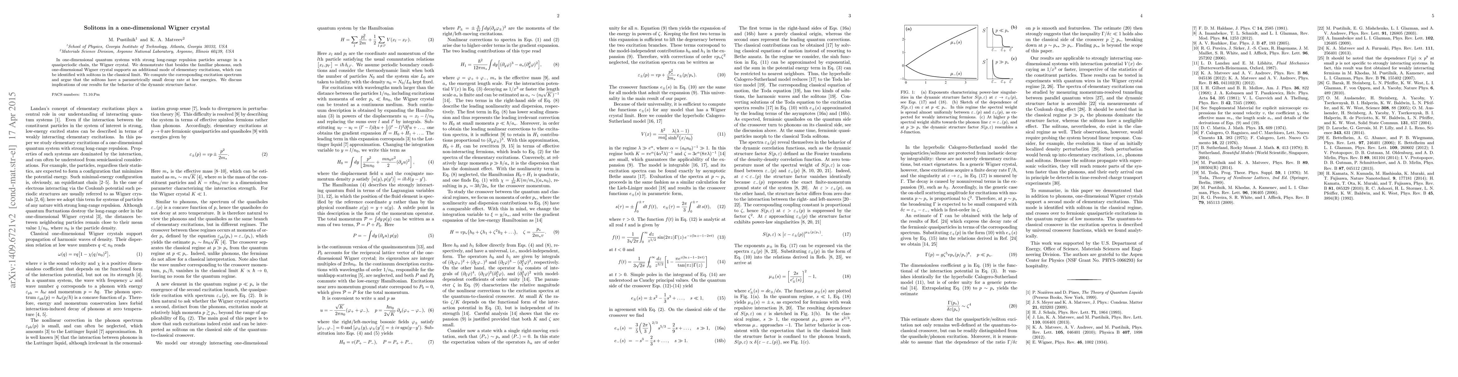 The paper presents a detailed microscopic model of a one-dimensional Wigner crystal, derives the low-energy Hamiltonian, and computes the excitation spectrum, identifying solitons as an additional mode of elementary excitations besides phonons.