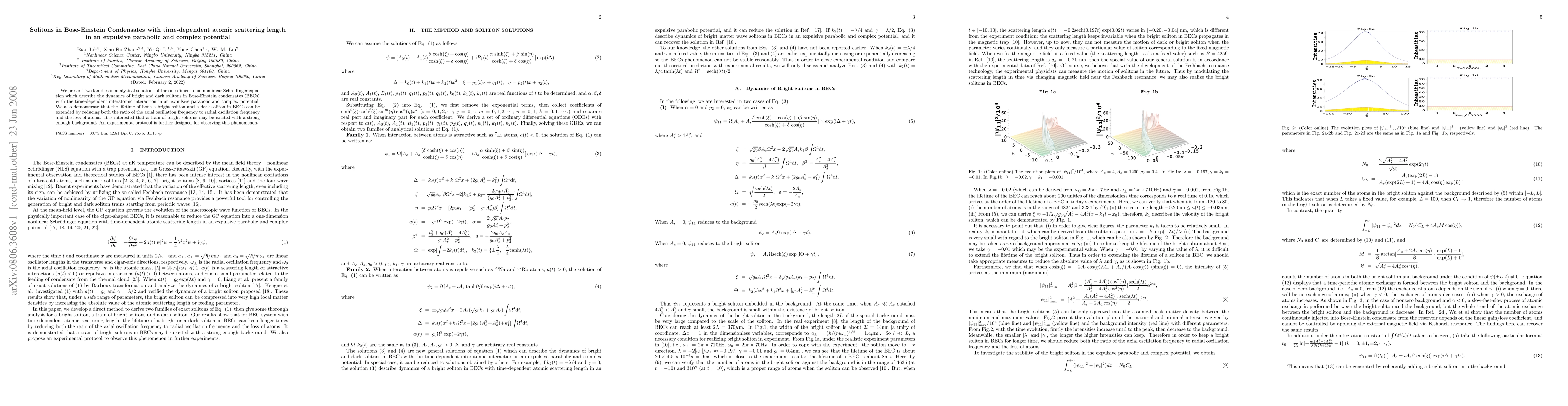 This paper presents analytical solutions for bright and dark solitons in Bose-Einstein condensates under time-dependent atomic scattering and complex potentials. It shows that soliton lifetimes can be extended by adjusting oscillation frequency ratios and reducing atom loss, with potential for exciting soliton trains in experiments.