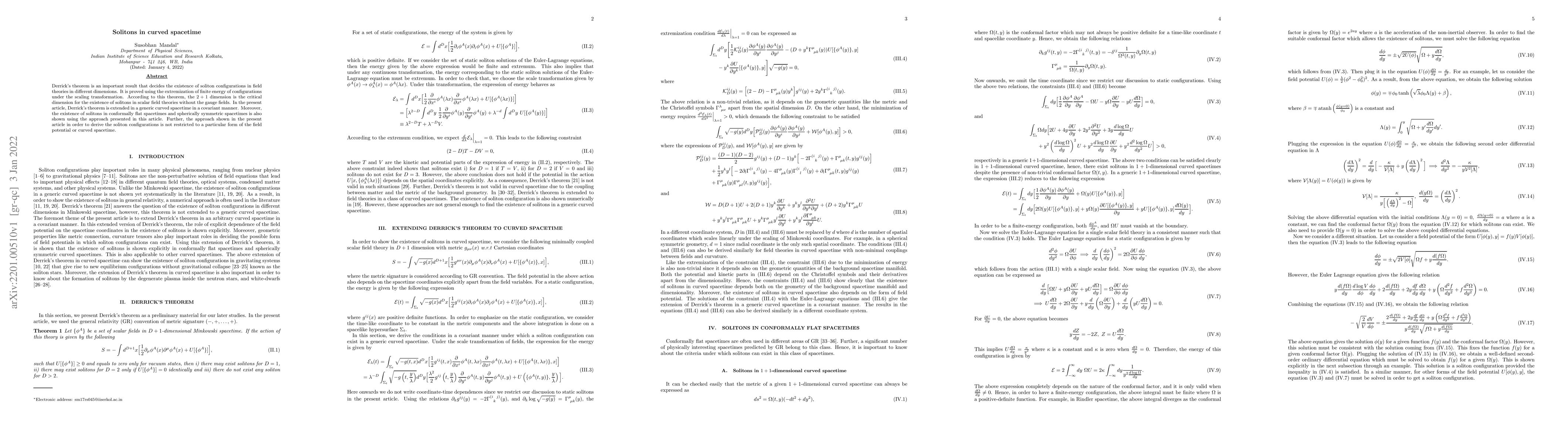 This paper extends Derrick's theorem to generic curved spacetimes, demonstrating the existence of solitons in conformally flat and spherically symmetric spacetimes. The method used is covariant and not restricted to specific field potentials or curved spacetime forms.