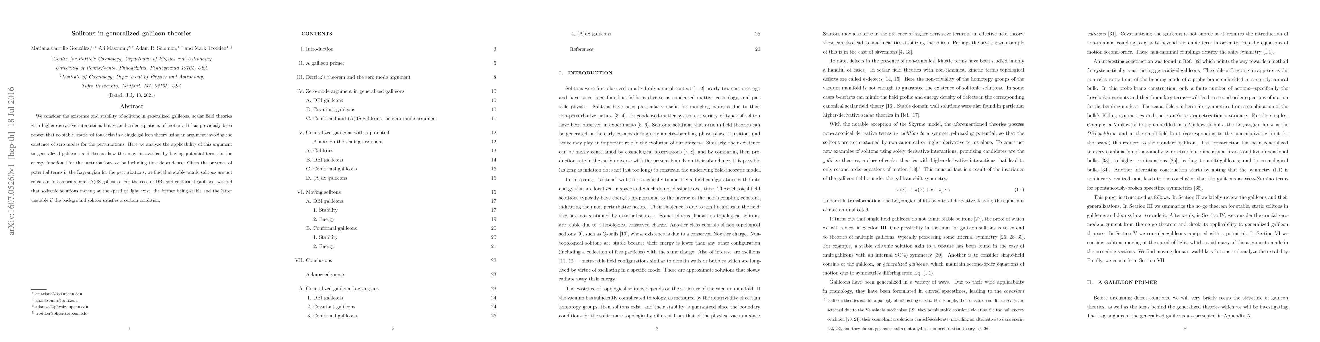 We consider the existence and stability of solitons in generalized galileons, scalar field theories with higher-derivative interactions but second-order equations of motion. It has previously been proven that no stable, static solitons exist in a single galileon theory using an argument invoking the existence of zero modes for the perturbations. Here we analyze the applicability of this argument to generalized galileons and discuss how this may be avoided by having potential terms in the energy functional for the perturbations, or by including time dependence. Given the presence of potential terms in the Lagrangian for the perturbations, we find that stable, static solitons are not ruled out in conformal and (A)dS galileons. For the case of DBI and conformal galileons, we find that solitonic solutions moving at the speed of light exist, the former being stable and the latter unstable if the background soliton satisfies a certain condition.