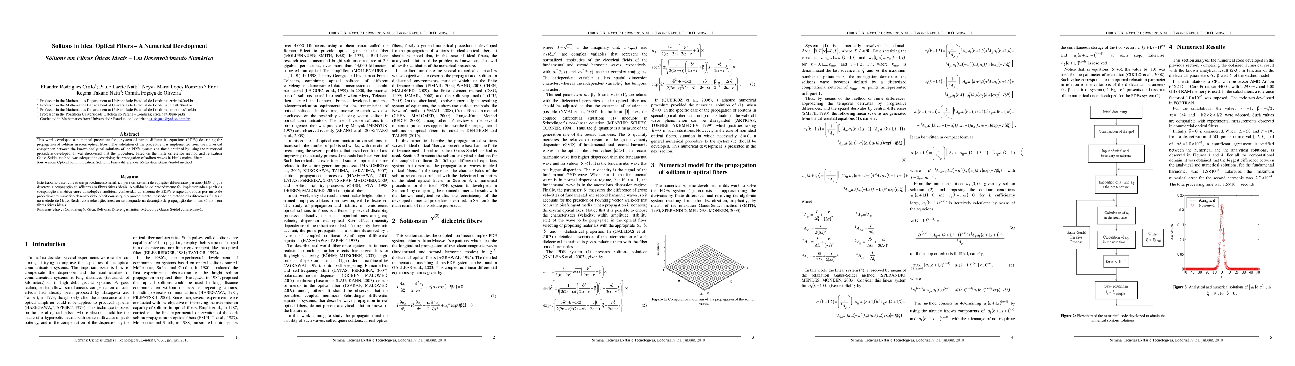 This work developed a numerical procedure for a system of partial differential equations (PDEs) describing the propagation of solitons in ideal optical fibers. The validation of the procedure was implemented from the numerical comparison between the known analytical solutions of the PDEs system and those obtained by using the numerical procedure developed. It was discovered that the procedure, based on the finite difference method and relaxation Gauss-Seidel method, was adequate in describing the propagation of soliton waves in ideals optical fibers.