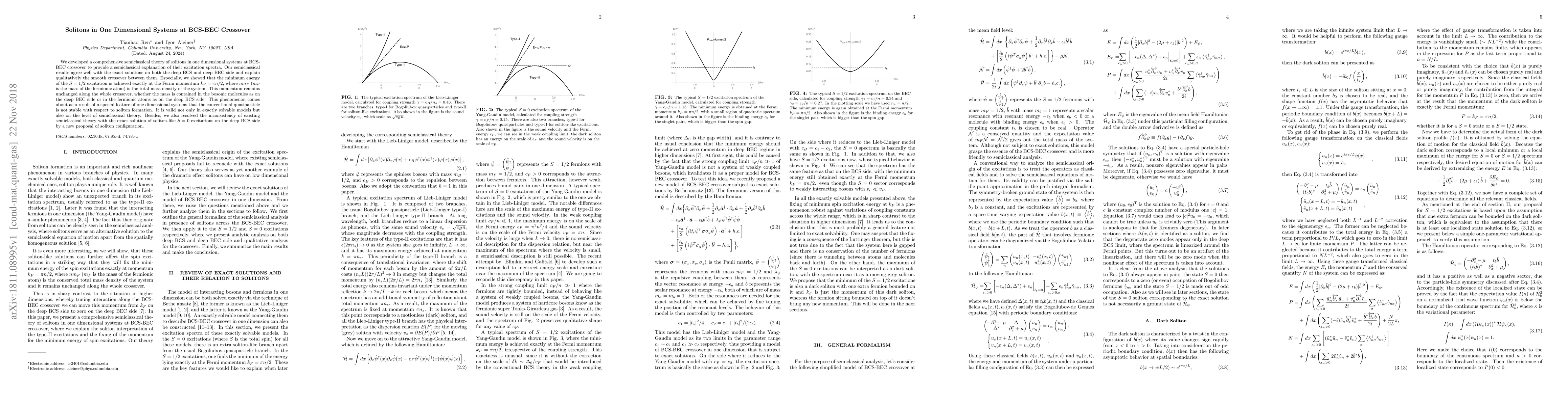 This paper develops a semiclassical theory explaining soliton excitation spectra in one-dimensional systems across the BCS-BEC crossover, showing agreement with exact solutions and highlighting the invariant Fermi momentum $k_F=\pi n/2$ throughout the crossover. It also resolves existing semiclassical theory inconsistencies regarding soliton-like $S=0$ excitations.