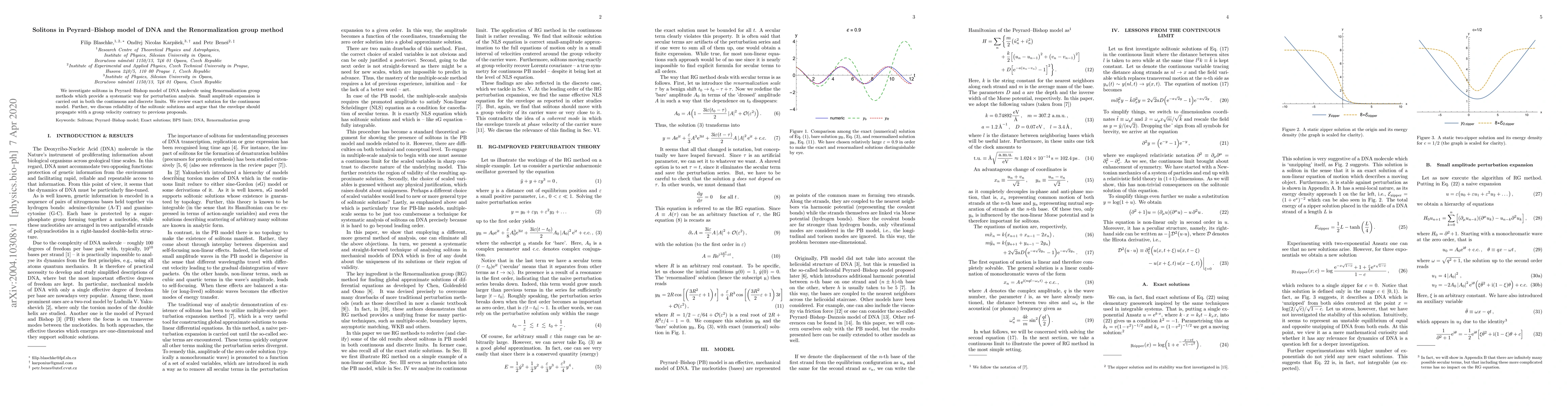 This paper explores solitons in the Peyrard-Bishop model of DNA using renormalization group methods for perturbation analysis. It finds that solitonic solutions should propagate with a group velocity, differing from previous proposals.