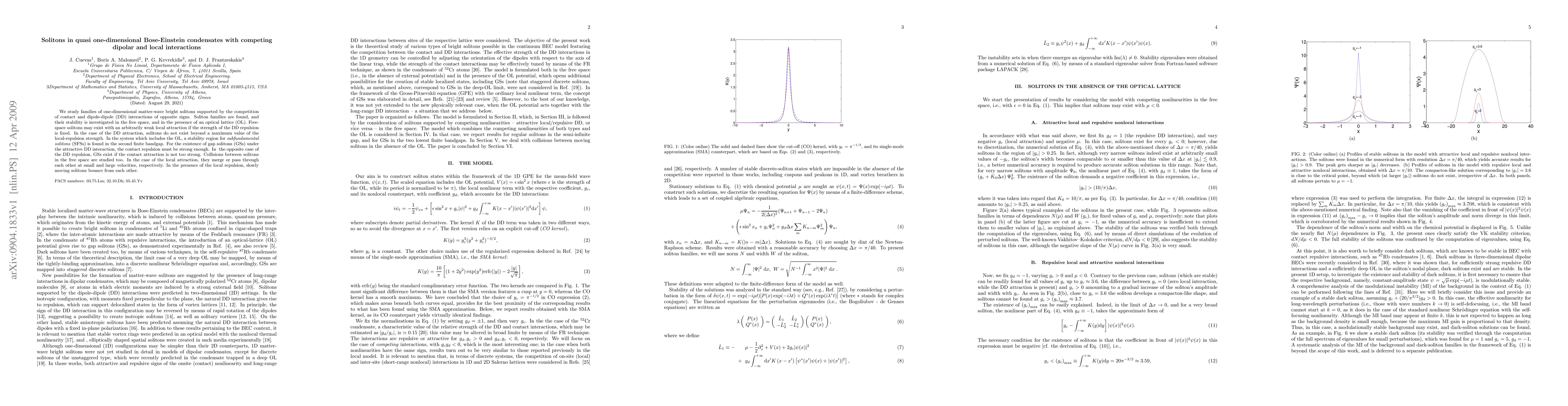 We study families of one-dimensional matter-wave bright solitons supported by the competition of contact and dipole-dipole (DD) interactions of opposite signs. Soliton families are found, and their stability is investigated in the free space, and in the presence of an optical lattice (OL). Free-space solitons may exist with an arbitrarily weak local attraction if the strength of the DD repulsion is fixed. In the case of the DD attraction, solitons do not exist beyond a maximum value of the local-repulsion strength. In the system which includes the OL, a stability region for \textit{subfundamental solitons} (SFSs) is found in the second finite bandgap. For the existence of gap solitons (GSs) under the attractive DD interaction, the contact repulsion must be strong enough. In the opposite case of the DD repulsion, GSs exist if the contact attraction is not too strong. Collisions between solitons in the free space are studied too. In the case of the local attraction, they merge or pass through each other at small and large velocities, respectively. In the presence of the local repulsion, slowly moving solitons bounce from each other.