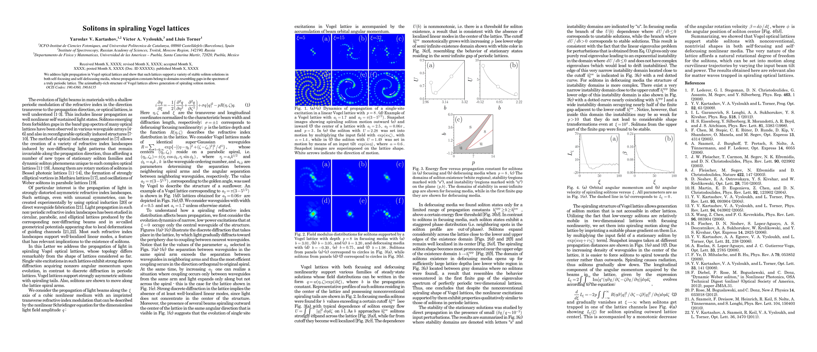 This paper investigates light propagation in Vogel optical lattices, demonstrating that they support stable soliton solutions in both self-focusing and self-defocusing media, with propagation constants in spectral gaps. The unique structure of Vogel lattices enables the generation of spiraling soliton motion.