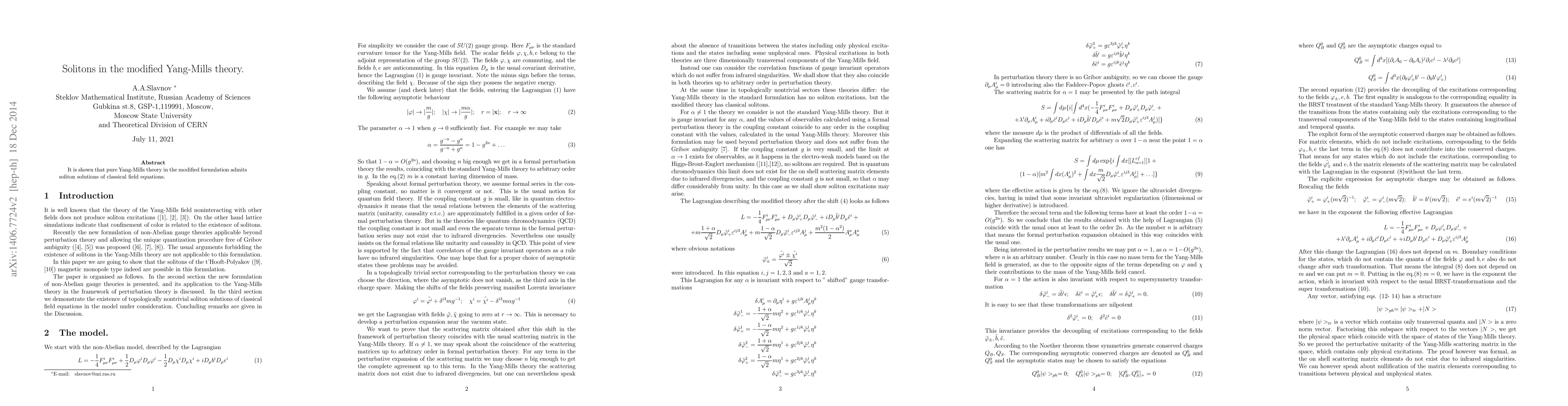 Summary: The modified Yang-Mills theory supports soliton solutions to its classical field equations, demonstrating the existence of stable, localized field configurations within this theoretical framework.