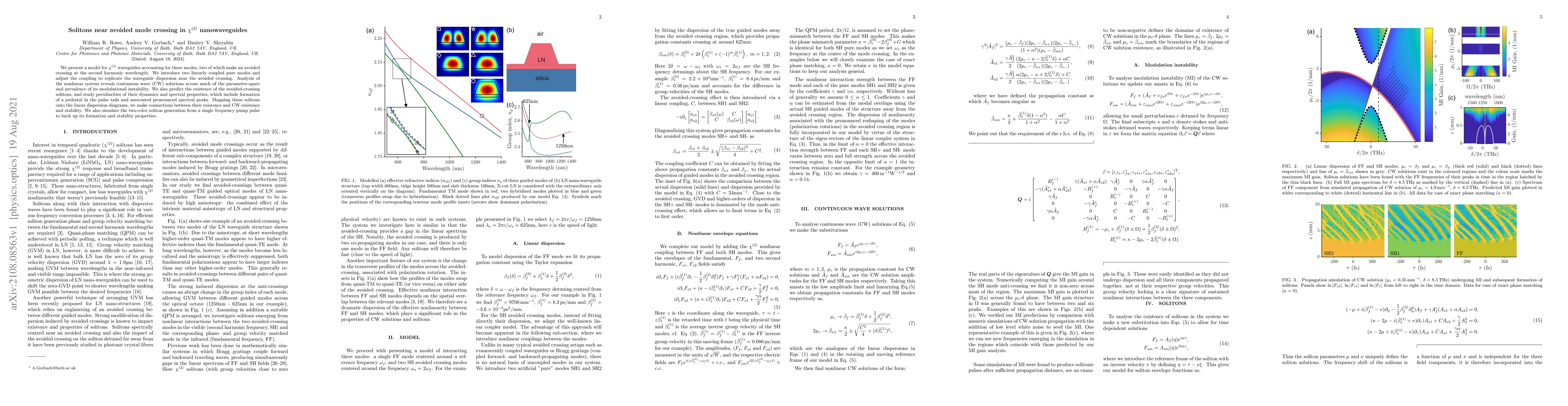 This paper models $\chi^{(2)}$ nanowaveguides with three modes, focusing on two that exhibit an avoided crossing. It predicts the existence of solitons near this crossing, characterized by unique dynamics and spectral features, including pedestal formation and pronounced spectral peaks, and demonstrates their generation from a single frequency pump.