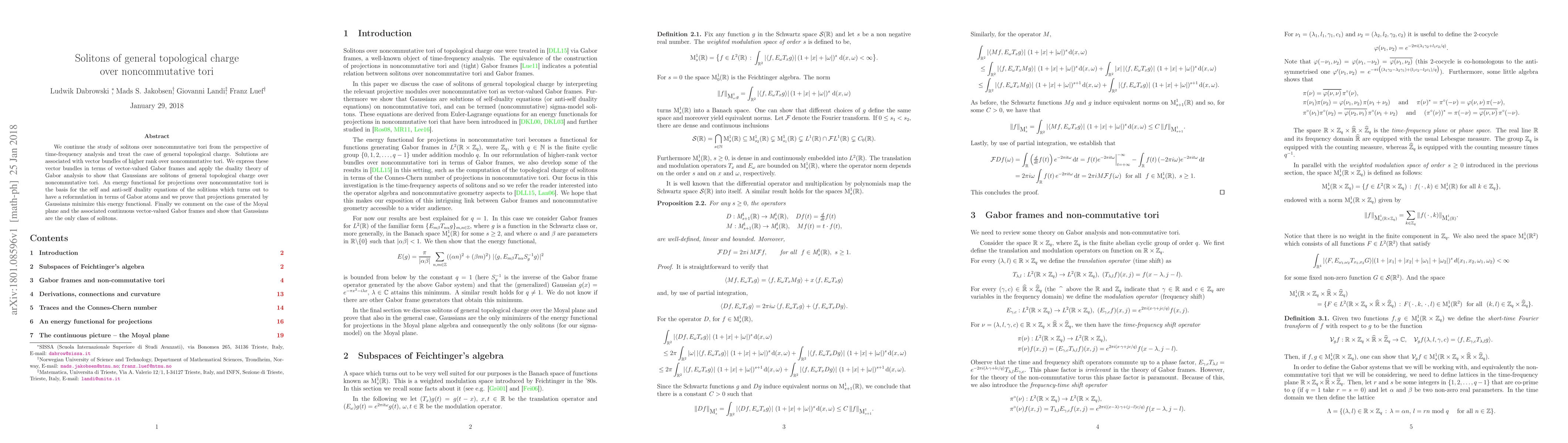 This paper investigates solitons over noncommutative tori with general topological charge, using vector bundles and vector-valued Gabor frames. It demonstrates that Gaussians are solitons via the application of Gabor analysis duality, and proves that Gaussian projections minimize an associated energy functional.