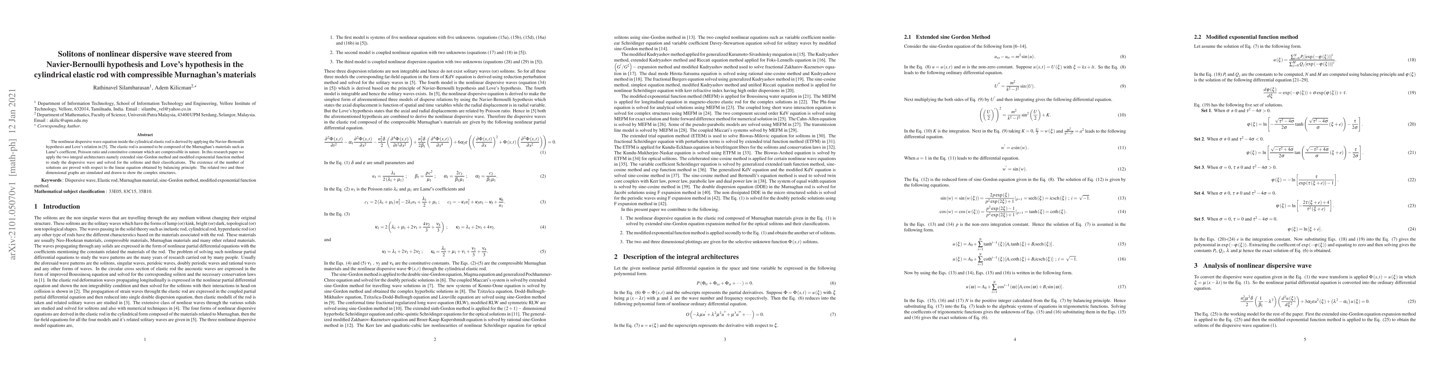 The nonlinear dispersive wave equation inside the cylindrical elastic rod is derived by applying the Navier-Bernoulli hypothesis and Love's relation in \cite{5}. The elastic rod is assumed to be composed of the Murnaghan's materials such as Lam$\acute{e}$'s coefficient, Poisson ratio and constitutive constant which are compressible in nature. In this research paper we apply the two integral architectures namely extended sine-Gordon method and modified exponential function method to study the dispersive wave and solved for the solitons and their classifications. The existence of the number of solutions are proved with respect to the linear equation obtained by balancing principle. The related two and three dimensional graphs are simulated and drawn to show the complex structures.