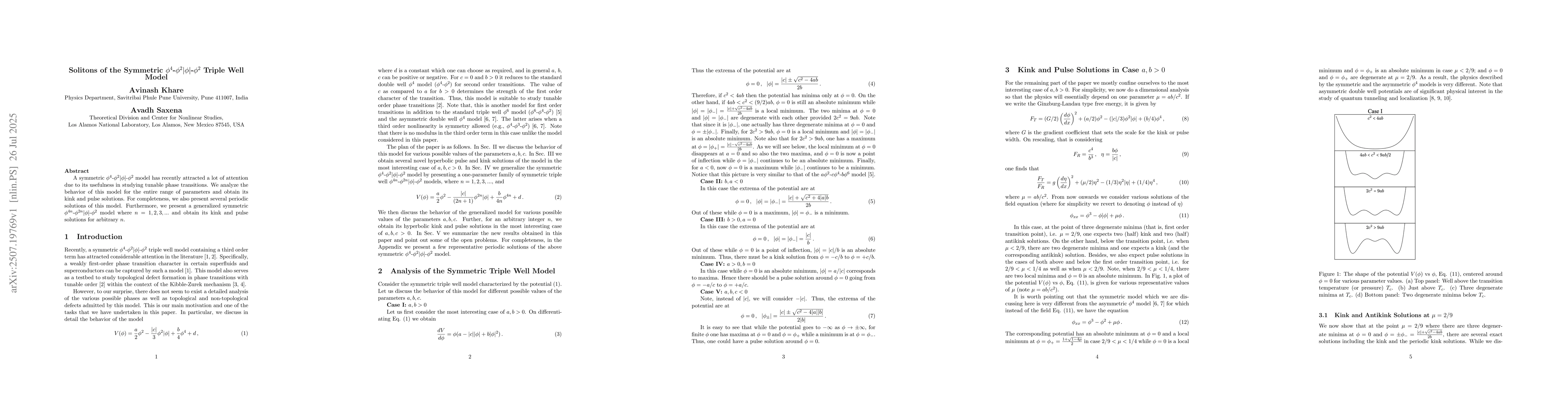 A symmetric $\phi^4$-$\phi^2 |\phi|$-$\phi^2$ model has recently attracted a lot of attention due to its usefulness in studying tunable phase transitions. We analyze the behavior of this model for the entire range of parameters and obtain its kink and pulse solutions. For completeness, we also present several periodic solutions of this model. Furthermore, we present a generalized symmetric $\phi^{4n}$-$\phi^{2n}|\phi|$-$\phi^2$ model where $n = 1, 2, 3, ...$ and obtain its kink and pulse solutions for arbitrary $n$.