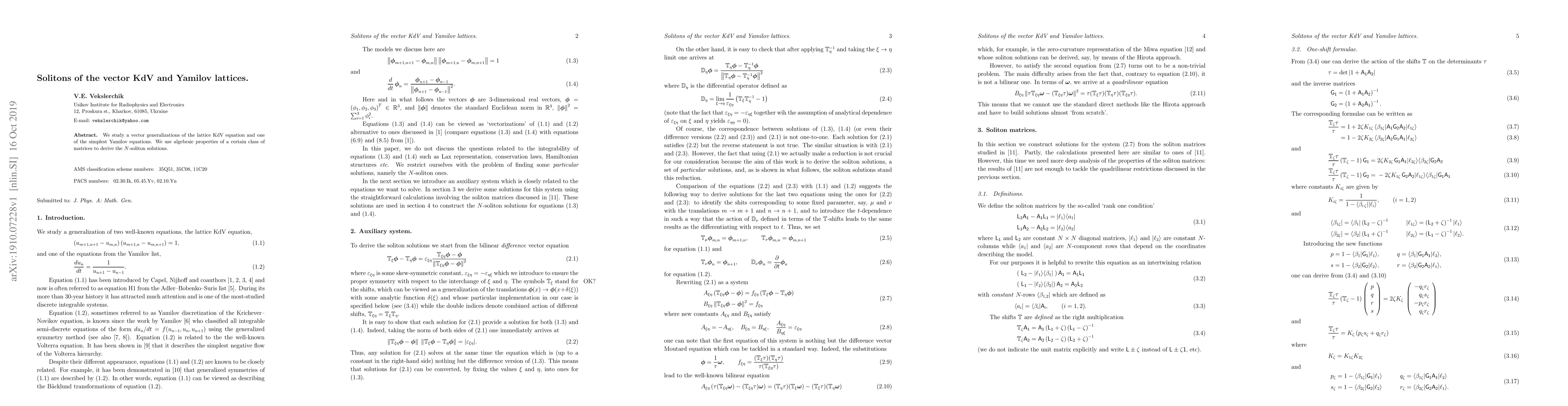 We study a vector generalizations of the lattice KdV equation and one of the simplest Yamilov equations. We use algebraic properties of a certain class of matrices to derive the N-soliton solutions.