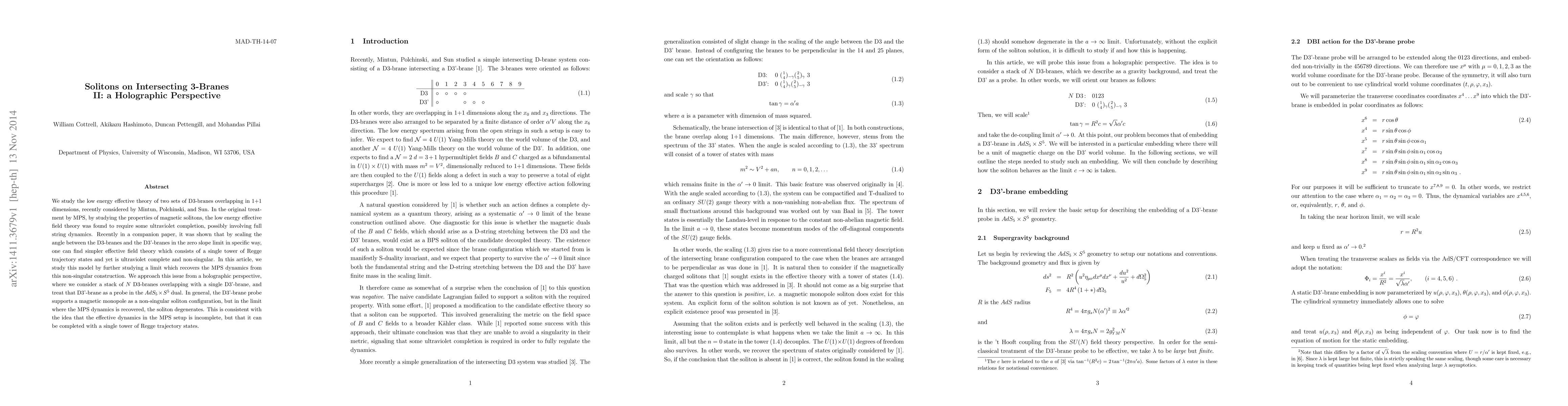 We study the low energy effective theory of two sets of D3-branes overlapping in 1+1 dimensions, recently considered by Mintun, Polchinski, and Sun. In the original treatment by MPS, by studying the properties of magnetic solitons, the low energy effective field theory was found to require some ultraviolet completion, possibly involving full string dynamics. Recently in a companion paper, it was shown that by scaling the angle between the D3-branes and the D3'-branes in the zero slope limit in specific way, one can find simpler effective field theory which consists of a single tower of Regge trajectory states and yet is ultraviolet complete and non-singular. In this article, we study this model by further studying a limit which recovers the MPS dynamics from this non-singular construction. We approach this issue from a holographic perspective, where we consider a stack of $N$ D3-branes overlapping with a single D3'-brane, and treat that D3'-brane as a probe in the $AdS_5 \times S^5$ dual. In general, the D3'-brane probe supports a magnetic monopole as a non-singular soliton configuration, but in the limit where the MPS dynamics is recovered, the soliton degenerates. This is consistent with the idea that the effective dynamics in the MPS setup is incomplete, but that it can be completed with a single tower of Regge trajectory states.