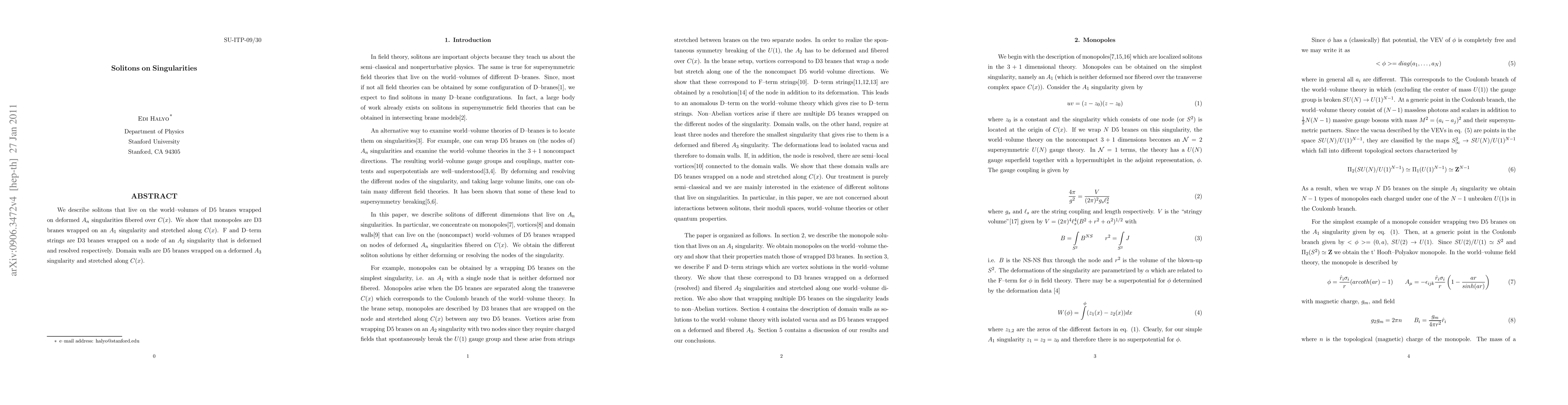 We describe solitons that live on the world--volumes of D5 branes wrapped on deformed $A_2$ singularities fibered over $C(x)$. We show that monopoles are D3 branes wrapped on a node of the deformed singularity and stretched along $C(x)$. F and D--term strings are D3 branes wrapped on a node of a singularity that is deformed and resolved respectively. Domain walls require deformed $A_3$ singularities and correspond to D5 branes wrapped on a node and stretched along $C(x)$.