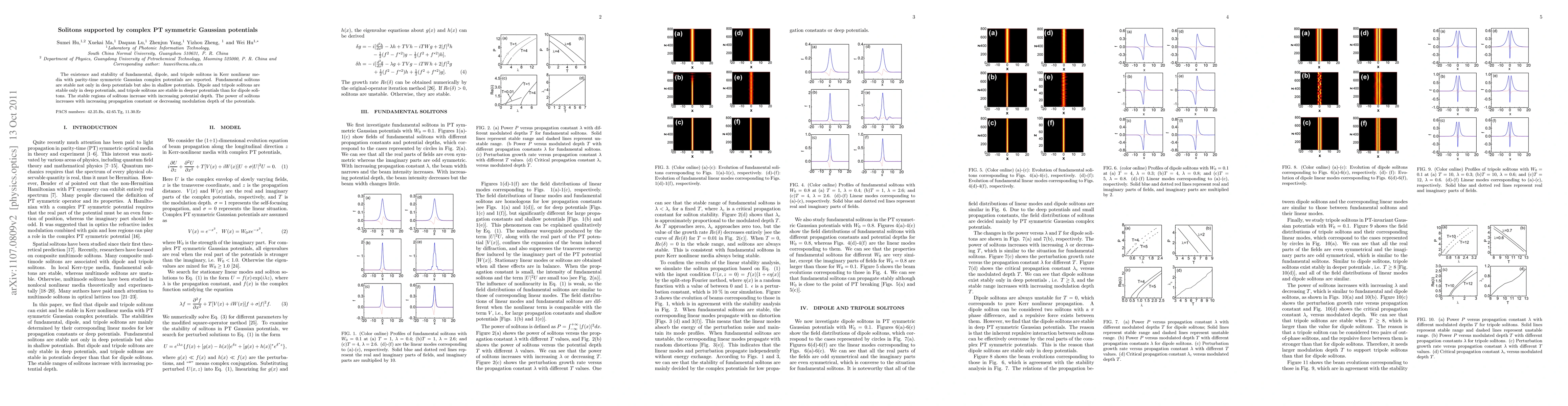The existence and stability of fundamental, dipole, and tripole solitons in Kerr nonlinear media with parity-time symmetric Gaussian complex potentials are reported. Fundamental solitons are stable not only in deep potentials but also in shallow potentials. Dipole and tripole solitons are stable only in deep potentials, and tripole solitons are stable in deeper potentials than for dipole solitons. The stable regions of solitons increase with increasing potential depth. The power of solitons increases with increasing propagation constant or decreasing modulation depth of the potentials.