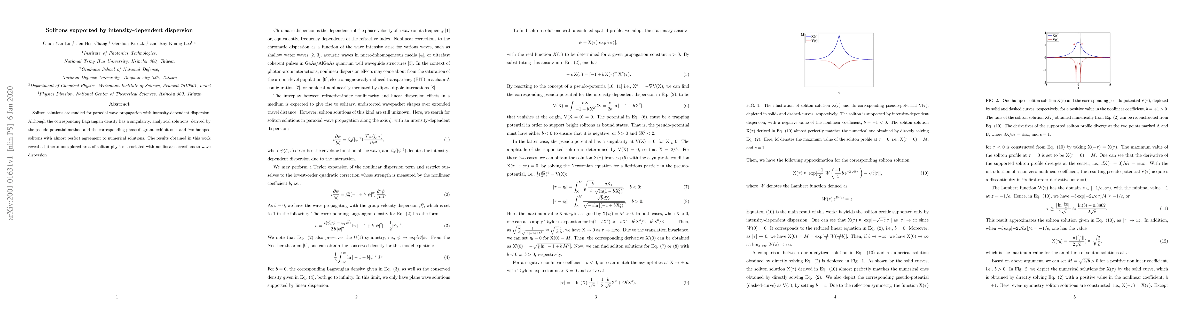 Soliton solutions are studied for paraxial wave propagation with intensity-dependent dispersion. Although the corresponding Lagrangian density has a singularity, analytical solutions, derived by the pseudo-potential method and the corresponding phase diagram, exhibit one- and two-humped solitons with almost perfect agreement to numerical solutions. The results obtained in this work reveal a hitherto unexplored area of soliton physics associated with nonlinear corrections to wave dispersion.