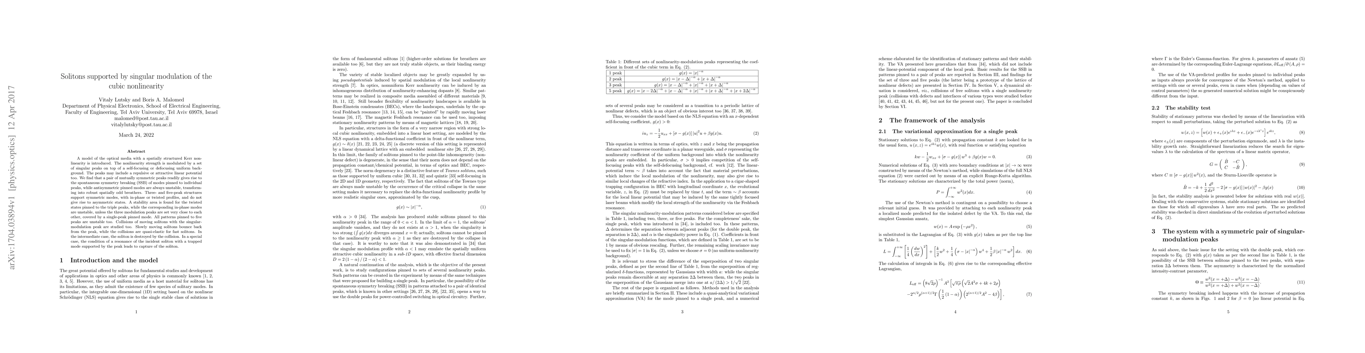 Researchers discovered that singular modulation of cubic nonlinearity in optical media can support solitons with spontaneous symmetry breaking, while certain collisions with these modulations lead to stable or destructive outcomes for moving solitons.