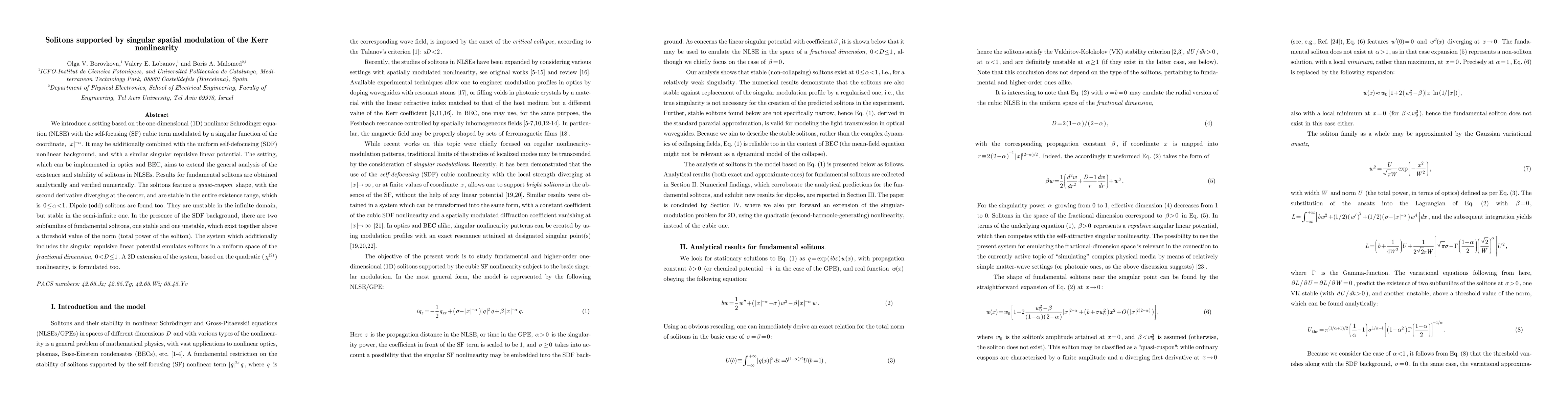 Researchers discovered solitons in a modified nonlinear Schrodinger equation with spatial modulation of Kerr nonlinearity, showing quasi-cusp shape and stability for 0 < a < 1, with varying behavior with added backgrounds and potentials.