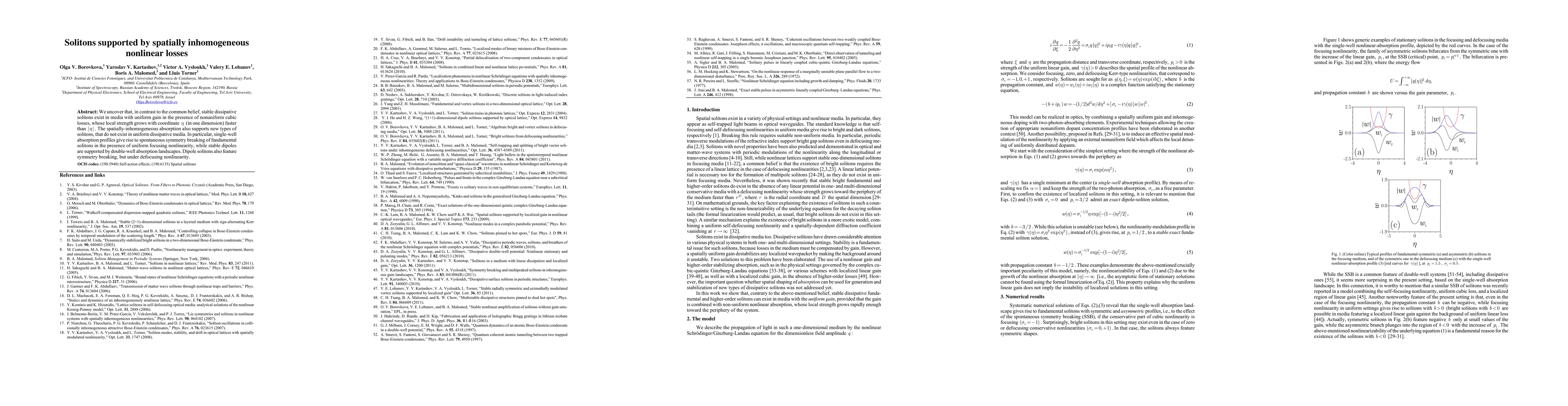 This paper reveals the existence of stable dissipative solitons in media with uniform gain and spatially inhomogeneous cubic losses, challenging conventional wisdom. It also introduces new soliton types, such as dipoles, supported by specific absorption profiles, demonstrating spontaneous symmetry breaking under both focusing and defocusing nonlinearities.