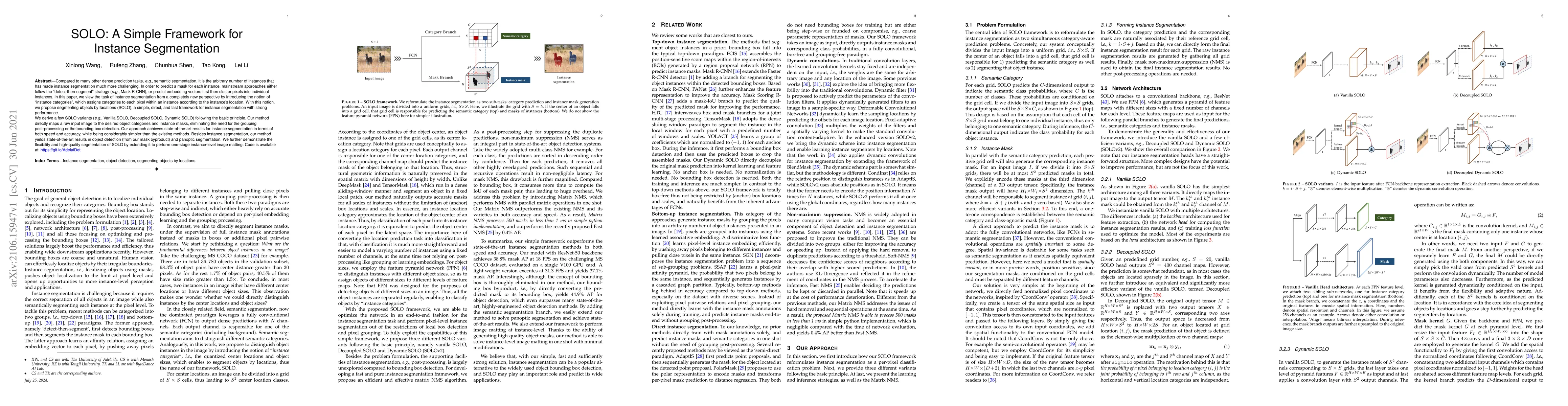 This paper introduces SOLO, a simple framework for instance segmentation that achieves state-of-the-art results in speed and accuracy, outperforming existing methods without requiring additional post-processing steps.