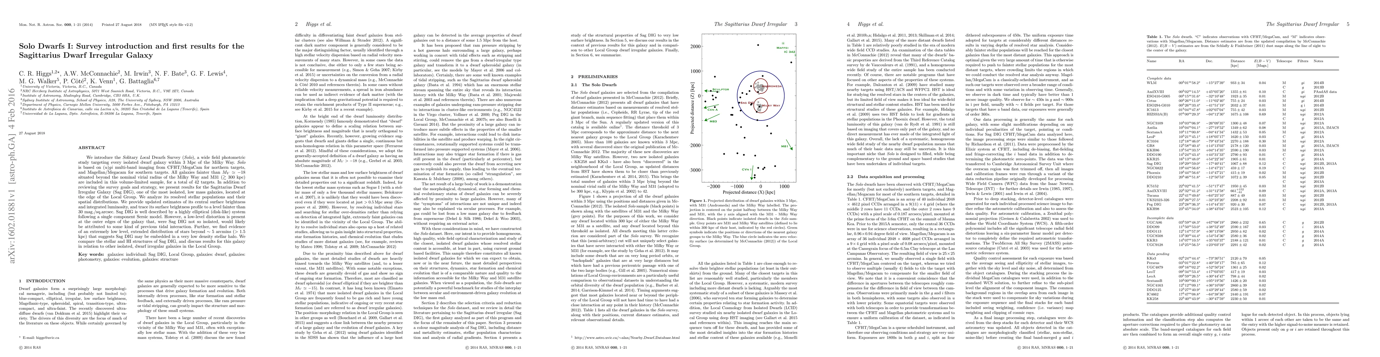 We introduce the Solitary Local Dwarfs Survey (Solo), a wide field photometric study targeting every isolated dwarf galaxy within 3 Mpc of the Milky Way. Solo is based on (u)gi multi-band imaging from CFHT/MegaCam for northern targets, and Magellan/Megacam for southern targets. All galaxies fainter than Mv = -18 situated beyond the nominal virial radius of the Milky Way and M31 (>300 kpc) are included in this volume-limited sample, for a total of 42 targets. In addition to reviewing the survey goals and strategy, we present results for the Sagittarius Dwarf Irregular Galaxy (Sag DIG), one of the most isolated, low mass galaxies, located at the edge of the Local Group. We analyze its resolved stellar populations and their spatial distributions. We provide updated estimates of its central surface brightness and integrated luminosity, and trace its surface brightness profile to a level fainter than 30 mag./sq.arcsec. Sag DIG is well described by a highly elliptical (disk-like) system following a single component Sersic model. However, a low-level distortion is present at the outer edges of the galaxy that, were Sag DIG not so isolated, would likely be attributed to some kind of previous tidal interaction. Further, we find evidence of an extremely low level, extended distribution of stars beyond 5 arcmins (>1.5 kpc) that suggests Sag DIG may be embedded in a very low density stellar halo. We compare the stellar and HI structures of Sag DIG, and discuss results for this galaxy in relation to other isolated, dwarf irregular galaxies in the Local Group.