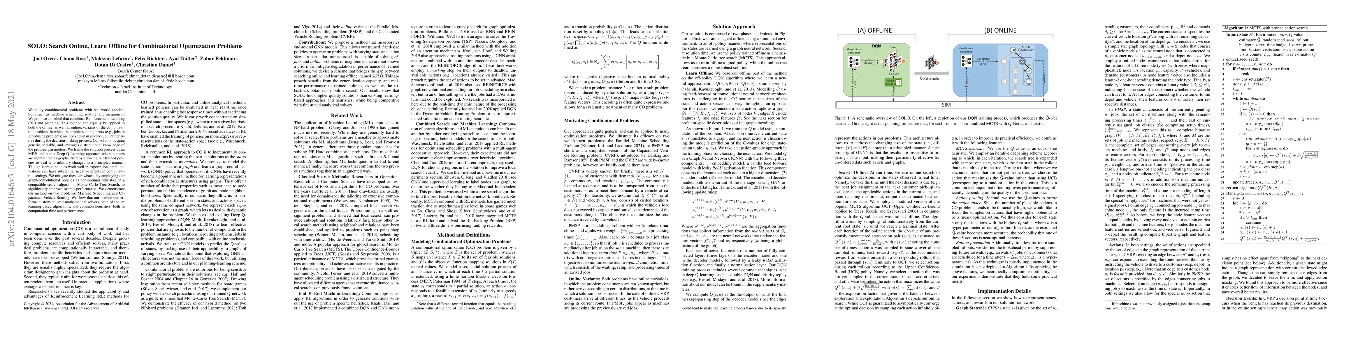 We study combinatorial problems with real world applications such as machine scheduling, routing, and assignment. We propose a method that combines Reinforcement Learning (RL) and planning. This method can equally be applied to both the offline, as well as online, variants of the combinatorial problem, in which the problem components (e.g., jobs in scheduling problems) are not known in advance, but rather arrive during the decision-making process. Our solution is quite generic, scalable, and leverages distributional knowledge of the problem parameters. We frame the solution process as an MDP, and take a Deep Q-Learning approach wherein states are represented as graphs, thereby allowing our trained policies to deal with arbitrary changes in a principled manner. Though learned policies work well in expectation, small deviations can have substantial negative effects in combinatorial settings. We mitigate these drawbacks by employing our graph-convolutional policies as non-optimal heuristics in a compatible search algorithm, Monte Carlo Tree Search, to significantly improve overall performance. We demonstrate our method on two problems: Machine Scheduling and Capacitated Vehicle Routing. We show that our method outperforms custom-tailored mathematical solvers, state of the art learning-based algorithms, and common heuristics, both in computation time and performance.