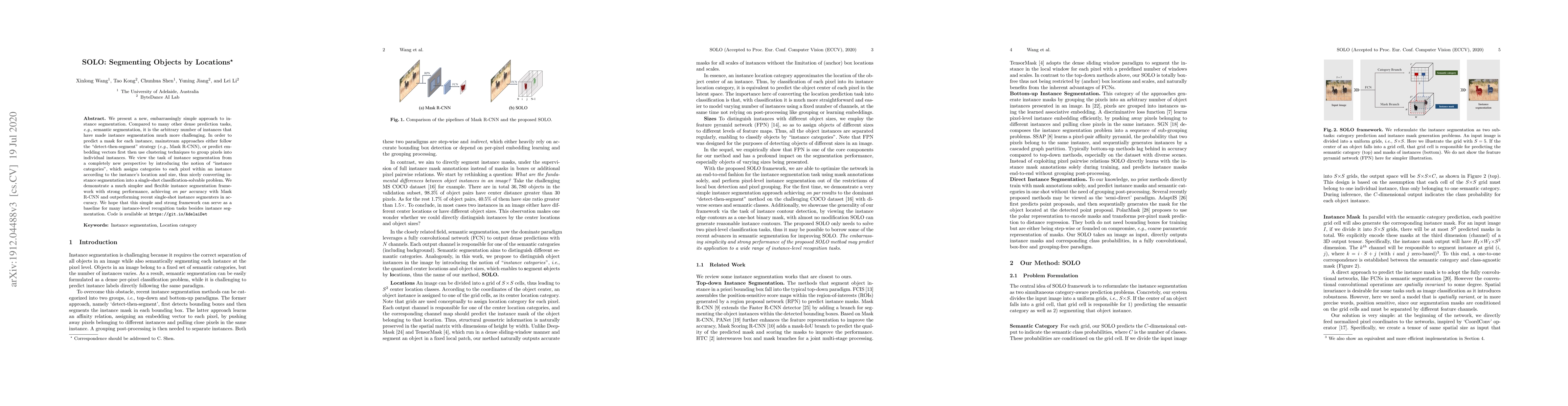 We present a new, embarrassingly simple approach to instance segmentation in images. Compared to many other dense prediction tasks, e.g., semantic segmentation, it is the arbitrary number of instances that have made instance segmentation much more challenging. In order to predict a mask for each instance, mainstream approaches either follow the 'detect-thensegment' strategy as used by Mask R-CNN, or predict category masks first then use clustering techniques to group pixels into individual instances. We view the task of instance segmentation from a completely new perspective by introducing the notion of "instance categories", which assigns categories to each pixel within an instance according to the instance's location and size, thus nicely converting instance mask segmentation into a classification-solvable problem. Now instance segmentation is decomposed into two classification tasks. We demonstrate a much simpler and flexible instance segmentation framework with strong performance, achieving on par accuracy with Mask R-CNN and outperforming recent singleshot instance segmenters in accuracy. We hope that this very simple and strong framework can serve as a baseline for many instance-level recognition tasks besides instance segmentation.