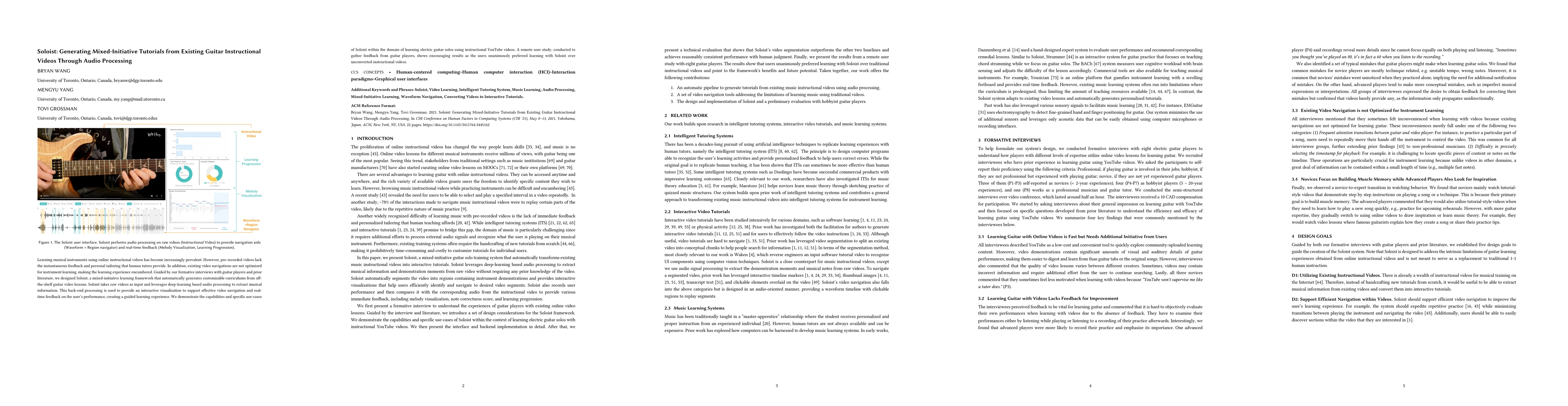Soloist is an innovative framework that generates personalized guitar tutorials from existing instructional videos using deep-learning audio processing. It provides interactive navigation and real-time feedback, enhancing the learning experience compared to traditional pre-recorded videos, as demonstrated by positive user feedback in a remote study.