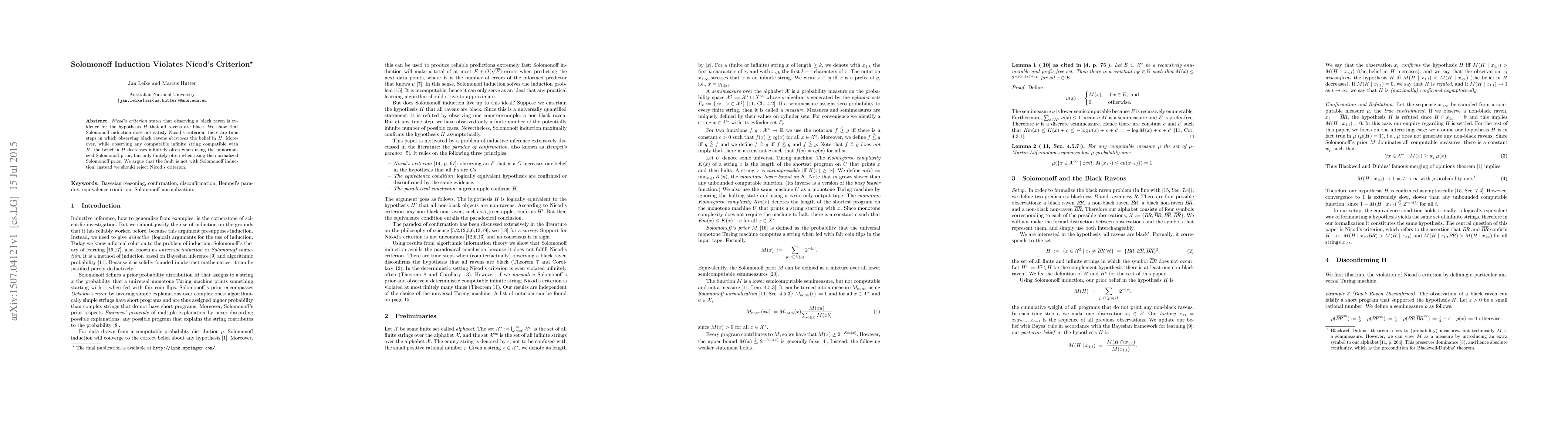 The paper analyzes Solomonoff Induction using bounds on A, B, C, D, and E derived from algorithmic information theory, focusing on computable infinite strings and their impact on belief in the hypothesis 'all ravens are black' (H).
