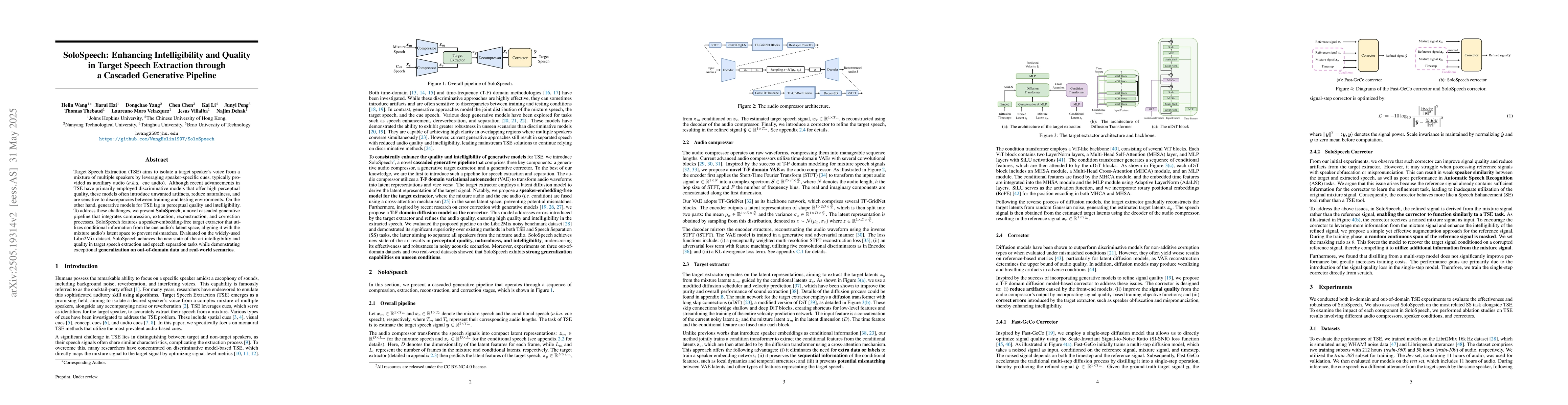 SoloSpeech is a novel cascaded generative pipeline that improves target speech extraction intelligibility and quality, achieving state-of-the-art results on Libri2Mix dataset while generalizing well to out-of-domain data.