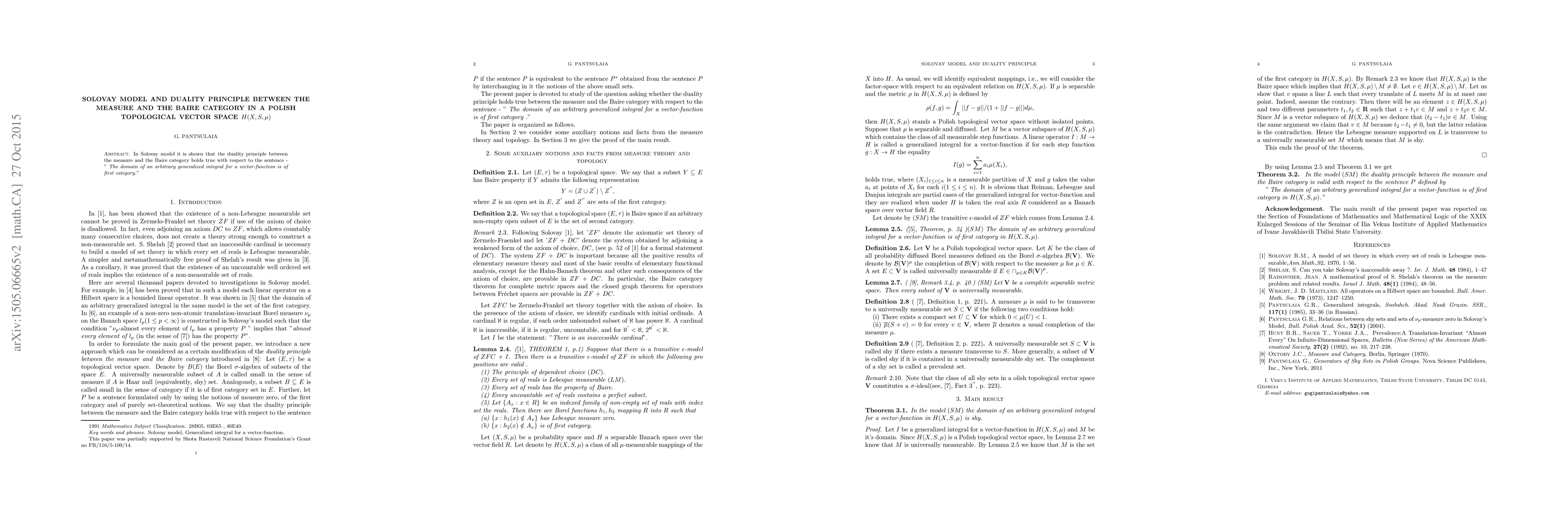This research demonstrates that in Solovay model, a duality principle linking measure and Baire category is valid. It confirms that the domain of any generalized integral for a vector-function is of first category in a Polish topological vector space H(X,S,μ).