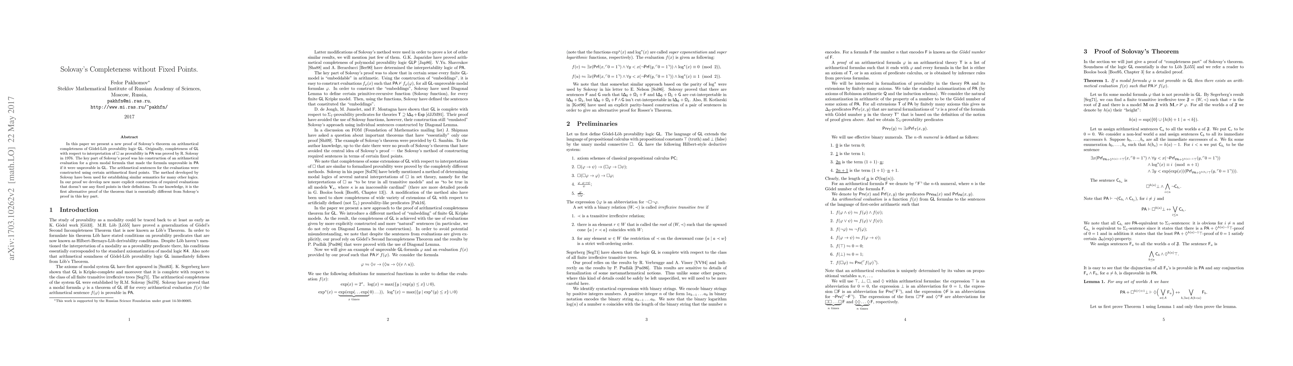 This paper presents a novel proof of Solovay's theorem on the arithmetical completeness of Gödel-Löb provability logic GL, avoiding the use of arithmetical fixed points in the construction of evaluations, offering a fundamentally different approach from Solovay's original proof.