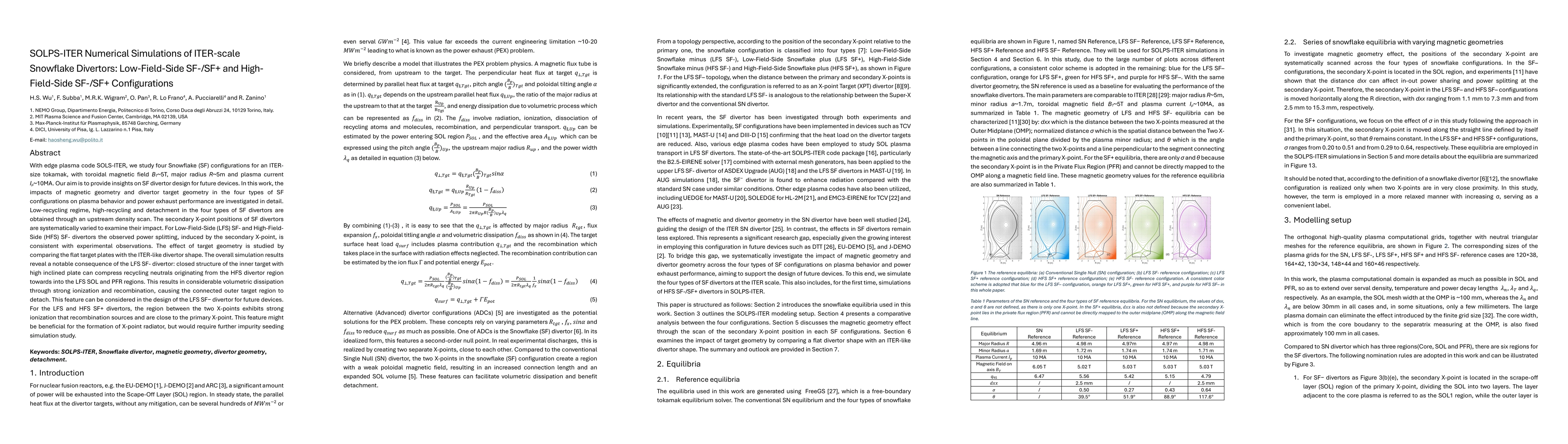 With edge plasma code SOLS-ITER, we study four Snowflake (SF) configurations for an ITER-size tokamak, with toroidal magnetic field BT=5T, major radius R=5m and plasma current Ip=10MA. Our aim is to provide insights on SF divertor design for future devices. In this work, the impacts of magnetic geometry and divertor target geometry in the four types of SF configurations on plasma behavior and power exhaust performance are investigated in detail. Low-recycling regime, high-recycling and detachment in the four types of SF divertors are obtained through an upstream density scan. The secondary X-point positions of SF divertors are systematically varied to examine their impact. For Low-Field-Side (LFS) SF- and High-Field-Side (HFS) SF- divertors the observed power splitting, induced by the secondary X-point, is consistent with experimental observations. The effect of target geometry is studied by comparing the flat target plates with the ITER-like divertor shape. The overall simulation results reveal a notable consequence of the LFS SF- divertor: closed structure of the inner target with high inclined plate can compress recycling neutrals originating from the HFS divertor region into the LFS SOL and PFR regions. This results in considerable volumetric dissipation through strong ionization and recombination, causing the connected outer target region to detach. This feature can be considered in the design of the LFS SF- divertor for future devices. For the LFS and HFS SF+ divertors, the region between the two X-points exhibits strong ionization and recombination sources close to the primary X-point. This feature might be beneficial for the formation of an X-point radiator, but would require further impurity seeding simulation study.