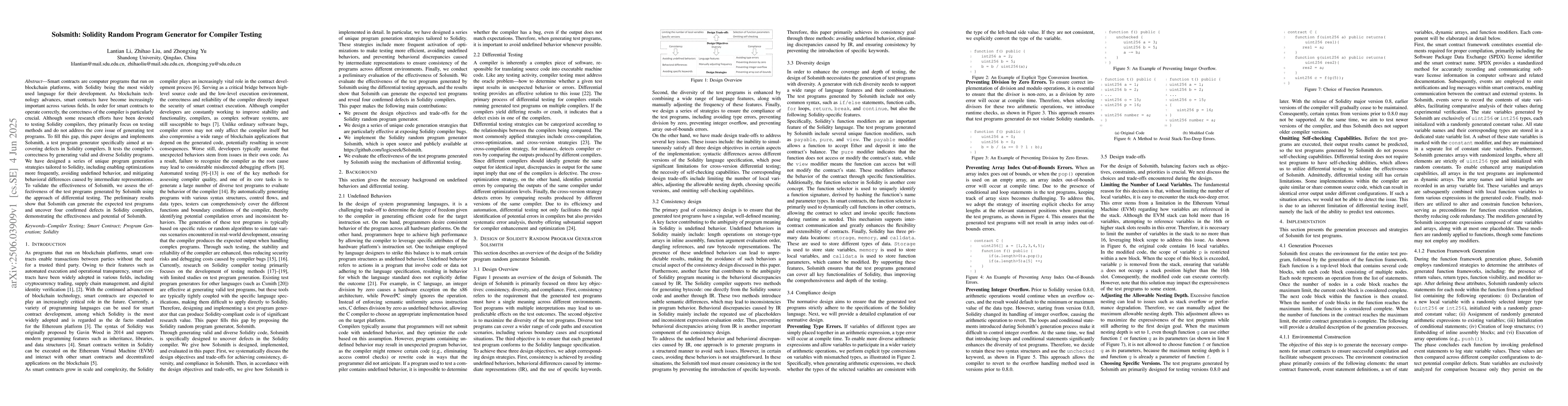 Solsmith, a Solidity-specific random program generator, and its validation through differential testing, providing a novel approach to Solidity compiler testing.