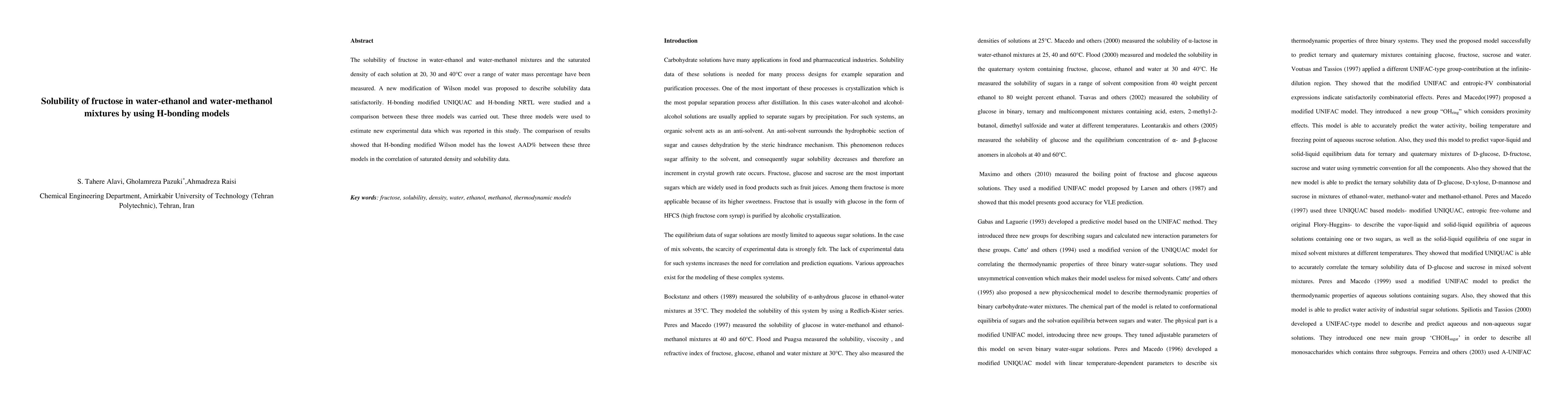 This study measures the solubility of fructose in water-ethanol and water-methanol mixtures at varying temperatures and water mass percentages, proposing a new H-bonding modified Wilson model for accurate solubility description. The H-bonding modified Wilson, UNIQUAC, and NRTL models were compared, with the modified Wilson model showing the lowest error in literature data correlation, and the modified UNIQUAC model proving most accurate in predicting new experimental solubility data.
