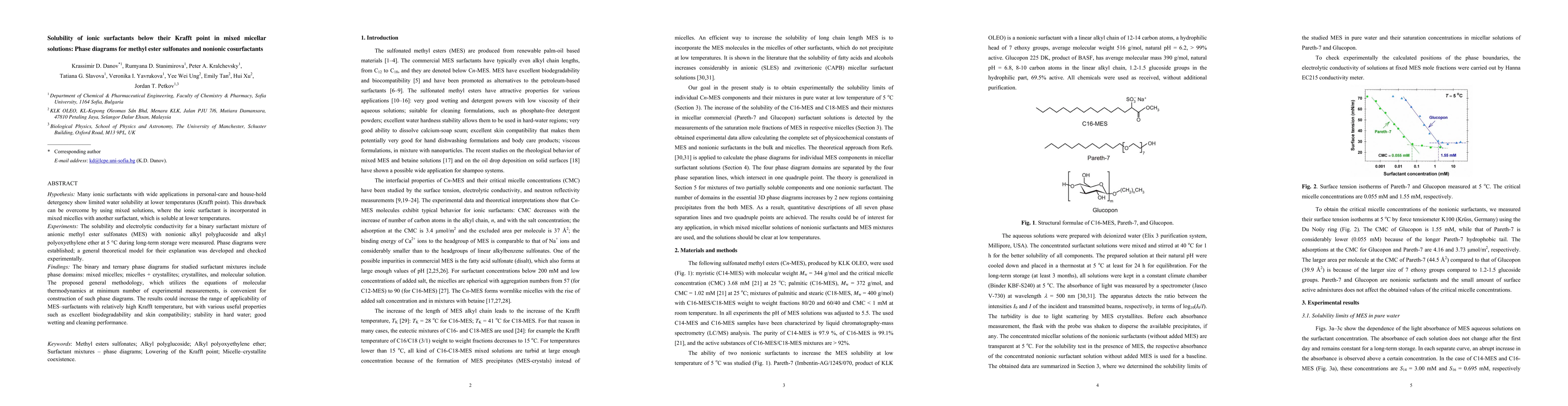 This paper investigates the solubility of ionic surfactants below their Krafft point in mixed micellar solutions, focusing on methyl ester sulfonates (MES) combined with nonionic cosurfactants. Phase diagrams were developed to understand the behavior of these mixtures, revealing enhanced solubility and stability at lower temperatures, which broadens the application range of these biocompatible and effective surfactants.