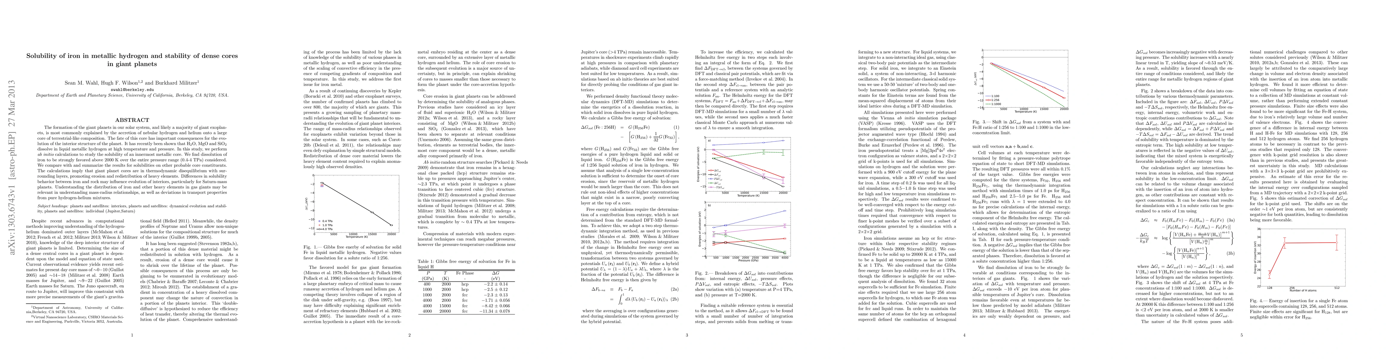This study uses ab initio calculations to determine that iron's solubility in metallic hydrogen is significantly favored at high temperatures and pressures, suggesting that giant planet cores are in thermodynamic disequilibrium, which could influence their interior evolution and mass-radius relationships.