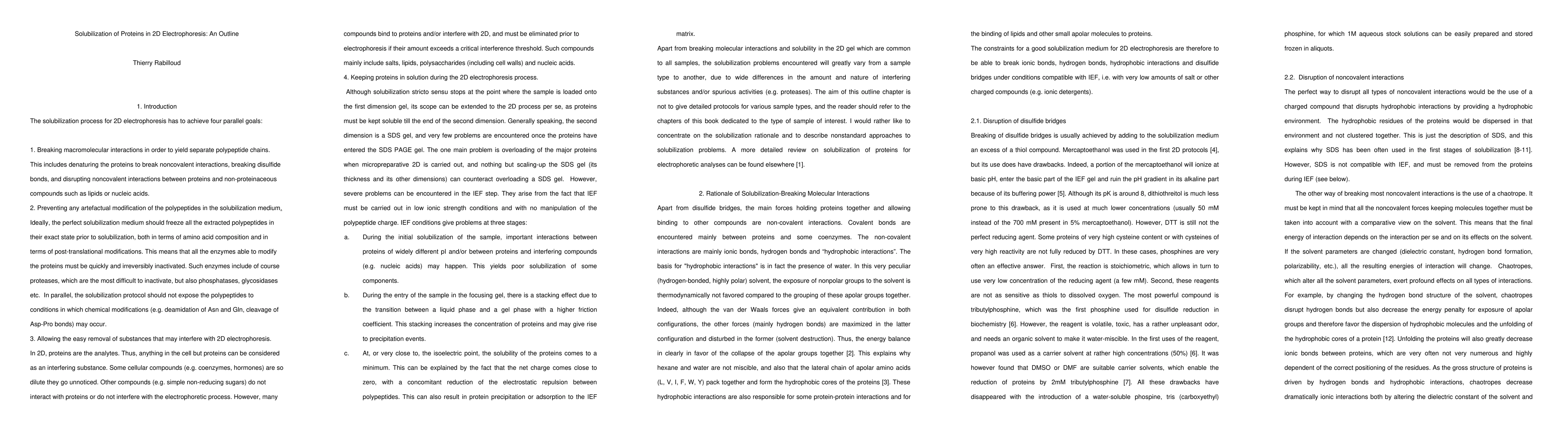 Protein solubilization for two-dimensional electrophoresis (2DE) has to break molecular interactions to separate the biological contents of the material of interest into isolated and intact polypeptides. This must be carried out in conditions compatible with the first dimension of 2DE, namely isoelectric focusing. In addition, the extraction process must enable easy removal of any nonprotein component interfering with the isoelectric focusing. The constraints brought in this process by the peculiar features of isoelectric focusing are discussed, as well as their consequences in terms of possible solutions and limits for the solubilization process.